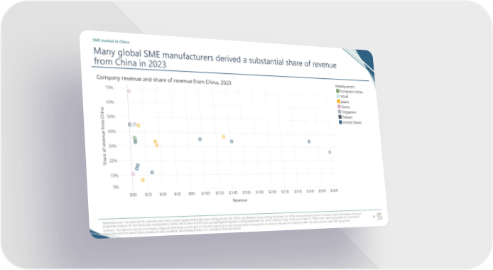 SME market in China Many global SME manufacturers derived a substantial share of revenue from China in 2023 Headquarters Company revenue and share of revenue from China, 2023 European Union Israel 70% Japan Korea 60% Singapore a Taiwan n i h 50% United States C m o r f 40% e u n e v e r 30% f o e r a 20% h S 10% 0% $0B $2B $4B $6B $8B $10B $12B $14B $16B $18B $20B $22B $24B $26B $28B $30B Revenue Notes/Sources: The data are for calendar year 2023, except Applied Materials (year ending January 28, 2024), Lam Research (year ending December 24, 2023), Kokusai Electric (share to China in April to December 2023 and projected revenue for the fiscal year ending March 2024), and Kulicke & Soffa and Jusung Engineering (year ending September 30, 2023). Lasertec Corp. revenue are sales to “Other Asia,” which accounted for 7 percent of 13 revenue. The data are based on company regional definitions as included in financial reports and may include sales of equipment or services that are not related to SME. The data include major SME equipment manufacturers for which China breakouts were available. Bloomberg Finance L.P.; company financial reports.