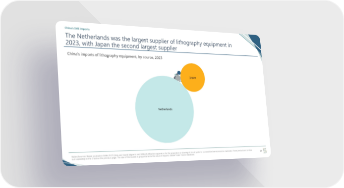 China’s SME imports The Netherlands was the largest supplier of lithography equipment in 2023, with Japan the second largest supplier China's imports of lithography equipment, by source, 2023 Japan Netherlands Notes/Sources: Based on trade in 8486.20.31 (step and repeat aligners) and 8486.20.39 (other apparatus for the projection or drawing of circuit patterns on sensitized semiconductor materials). These products are broken 23 out separately in the chart on the previous page. The size of the bubble is proportional to the value of imports. Global Trade Tracker database.