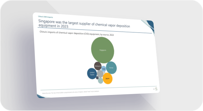 China’s SME imports Singapore was the largest supplier of chemical vapor deposition equipment in 2023 China's imports of chemical vapor deposition (CVD) equipment, by source, 2023 Singapore Malaysia Korea Italy United States Japan Notes/Sources: The size of the bubble is proportional to the value of imports. Global Trade Tracker database. 24