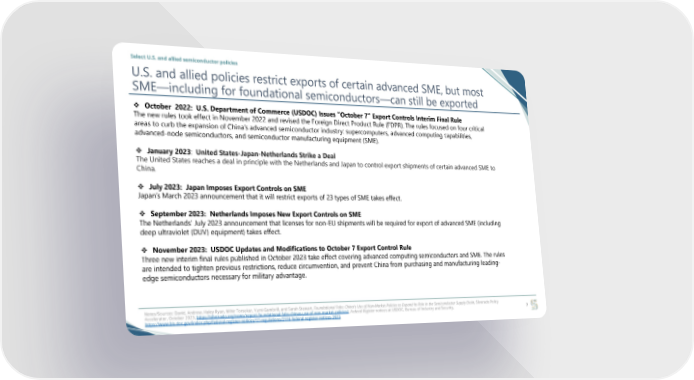 Select U.S. and allied semiconductor policies U.S. and allied policies restrict exports of certain advanced SME, but most SME—including for foundational semiconductors—can still be exported v October 2022: U.S. Department of Commerce (USDOC) Issues “October 7” Export Controls Interim Final Rule The new rules took effect in November 2022 and revised the Foreign Direct Product Rule (FDPR). The rules focused on four critical areas to curb the expansion of China’s advanced semiconductor industry: supercomputers, advanced computing capabilities, advanced-node semiconductors, and semiconductor manufacturing equipment (SME). v January 2023: United States-Japan-Netherlands Strike a Deal The United States reaches a deal in principle with the Netherlands and Japan to control export shipments of certain advanced SME to China. v July 2023: Japan Imposes Export Controls on SME Japan’s March 2023 announcement that it will restrict exports of 23 types of SME takes effect. v September2023: Netherlands Imposes New Export Controls on SME The Netherlands’ July 2023 announcement that licenses for non-EU shipments will be required for export of advanced SME (including deep ultraviolet (DUV) equipment) takes effect. v November 2023: USDOC Updates and Modifications to October 7 Export Control Rule Three new interim final rules published in October 2023 take effect covering advanced computing semiconductors and SME. The rules are intended to tighten previous restrictions, reduce circumvention, and prevent China from purchasing and manufacturing leading- edgesemiconductors necessary for military advantage. Notes/Sources: David, Andrew, Haley Ryan, Mihir Torsekar, Yumi Gambrill, and Sarah Stewart, Foundational Fabs: China's Use of Non-Market Policies to Expand Its Role in the Semiconductor Supply Chain, Silverado Policy Accelerator, October 2023, https://silverado.org/news/report-foundational-fabs-chinas-use-of-non-market-policies/; Federal Register notices at USDOC, Bureau of Industry and Security, 7 https://www.bis.doc.gov/index.php/federal-register-notices/17-regulations/2116-federal-register-notices-2023.