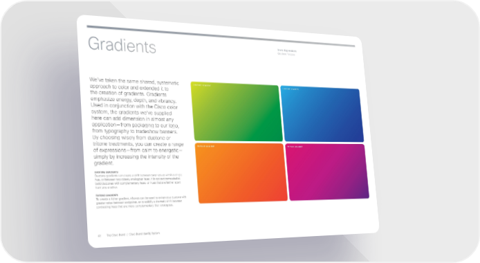 Brand expressions Œradients Œradient ƒalettes e’ve taken the sae shared ssteatic duoTone GradIenT duoTone GradIenT aroach to color and etended it to the creation of gradients. Œradients ehasi›e energ deth and vibranc. ’sed in con¨unction with the Cisco color sste the gradients we’ve sulied here can add diension in alost an alication—fro ackaging to our logo fro tograh to tradeshow banners. B choosing wisel fro duotone or tritone treatents ou can create a range TrITone GradIenT TrITone GradIenT of eressions—fro cal to energetic— sil b increasing the intensit of the gradient. DUOTONE GRADIENTS Žuotone gradients can create a shift between tonal values within a single hue or between two closel analogous hues. t is not recoended to build duotones with coleentar hues or hues that are farther aart fro one another. TRITONE GRADIENTS To create a richer gradient tritones can be used to enhance a duotone with greater value between endoints or to solidif a draatic shift between contrasting hues that are ore coleentar than analogous. €‡ The Cisco Brand / Cisco Brand dentit ste