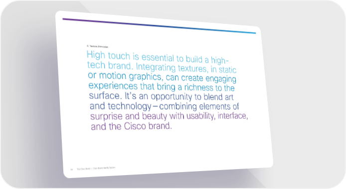 8. Texture Principles Ÿigh touch is essential to build a highš tech brand. ntegrating tetures in static or otion grahics can create engaging eeriences that bring a richness to the surface. t’s an oortunit to blend art and technolog—cobining eleents of surrise and beaut with usabilit interface and the Cisco brand. ˆ€ The Cisco Brand / Cisco Brand dentit ste