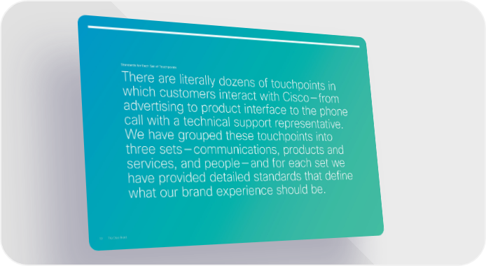 Standards for each Set of Touchpoints There are literall do›ens of touchoints in which custoers interact with Cisco—fro advertising to roduct interface to the hone call with a technical suort reresentative. e have groued these touchoints into three sets—counications roducts and services and eole—and for each set we have rovided detailed standards that define what our brand eerience should be. 10 The Cisco Brand