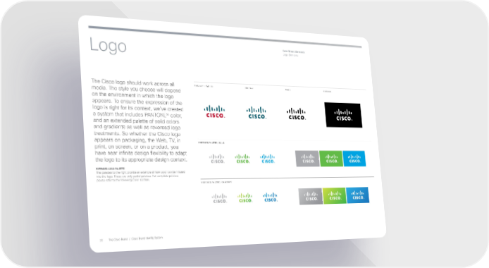 Core Brand elements ‹ogo ‹ogo …leents The Cisco logo should work across all PmS 7477 + PmS 187 PmS 7477 BLaCK reVerSed edia. The stle ou choose will deend on the environent in which the logo aears. To ensure the eression of the logo is right for its contet we’ve created a sste that includes ƒA¢T‰¢…® color and an etended alette of solid colors and gradients as well as reversed logo treatents. o whether the Cisco logo aears on ackaging the eb T‚ in PreFerred PaLeTTe / SoLId rint on screen or on a roduct ou have near infinite design fleibilit to adat the logo to its aroriate design contet. EXTENDED LOGO PALETTE The alettes to the right rovide an eale of how color can be infused into the logo. These are onl artial alettes. •or colete alettes lease refer to the following Color section. PreFerred PaLeTTe / GradIenTS 20 The Cisco Brand / Cisco Brand dentit ste