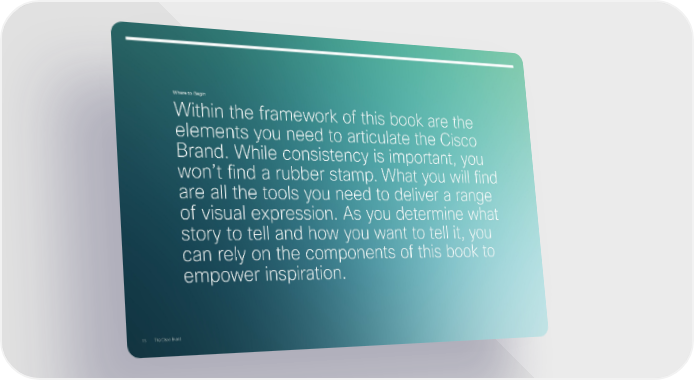 Where to Begin ithin the fraework of this book are the eleents ou need to articulate the Cisco Brand. hile consistenc is iortant ou won’t find a rubber sta. hat ou will find are all the tools ou need to deliver a range of visual eression. As ou deterine what stor to tell and how ou want to tell it ou can rel on the coonents of this book to eower insiration. 1‡ The Cisco Brand