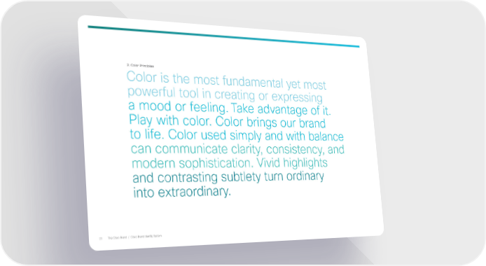 2. Color Principles Color is the ost fundaental et ost owerful tool in creating or eressing a ood or feeling. Take advantage of it. ƒla with color. Color brings our brand to life. Color used sil and with balance can counicate clarit consistenc and odern sohistication. ‚ivid highlights and contrasting subtlet turn ordinar into etraordinar. 2‡ The Cisco Brand / Cisco Brand dentit ste