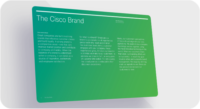 Cisco Brand Story The Cisco Brand Cisco and its Brand Cisco and its Brand Œreat coanies are built on strong o what is a brand” il ut a deall our custoers’ ercetions brands that influence custoer choice brand is a constellation of eeriences of Cisco should align with our own and build loalt. A strong brand is erceived in the heart and ind of asirations. e asire to be a coan a coetitive asset—one that can the custoer. …ver tie a custoer that brings eole together using irove arket osition and contribute engages with our coan these the ost innovative technolog in the to coan rofitabilit. hen the eeriences grow. At Cisco our brand is world. hen our custoers share essence of a brand is understood a roise we ake to our custoers—a that vision our branding efforts will within a coan it can serve as a roise we strive to fulfill at ever oint be successful. To reach that goal source of insiration eciteent of custoer interaction. •or eloees re—uires active and uroseful brand and eloee satisfaction. the brand roise is reflected in their anageent. e begin b defining dail work eerience. what our asirations are˜ these are the ercetions we want our custoers to have. ˆ The Cisco Brand