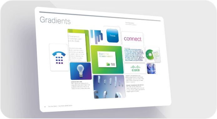 Brand expressions Œradients Cross ¥edia Alication „ptimi…e meetings using integrated Connect Your Employees to Cisco eb €udio. Schedule easily Cisco Spectrum Suppliers and Customers, and and join from computer or phone. ƒntellience Your Business to the World. Solution Brochure Cisco eb €udio Wh Cisco Web Audio: For a small business like yours to communicate Highlights: effectively with suppliers and customers in today’s Simplified Service competitive business environment, you need ready Use just one convenient provider for all your integrated audio and access to inormation, updated in real time. With the Cisco United web meetings. Audio Control and Management riht solution, your business can collaborate more Wireless Network Improve meeting productivity using easy audio settings and effectively and problemsolve like never beore. management tools. he Cisco® Smart Business Communications International Service Meet with attendees—by phone or computer—in more System SBCS is an allinone networkin and Choose the right integrated audio options for our needs than 200 countries. communications solution that will enable you to Improve business efficiency using eb €udio to connect up to ‡00 attendees per Audio Access Safeguards meeting. Set up your session with easyˆtoˆuse phone options including glob al Secure integrated audio meetings do €ust that. ‚nd it includes the peace o mind that callbac services. „r eep your phone lines free while you save money with integrated by controlling attendance. ‰oice over I‚ ЉoI‚‹—from any computer worldwide. Œeliver audio to thousands of comes with support rom the worldwide leader in participants in oneˆtoˆmany events using Cisco eb vent Center with eb €udio Customized Service Žroadcast. et eb €udio services for a single monthly fee. et a fleible pacage and your choice of integrated audio options networkin and communications. eep our meetings private and productive for each session. ain better control over your meetings. Identify which meeting attendee is speaing Compatible with: with €ctive aler indicators. Manage call activity with line muting the ability to add • Cisco ebEx Meeting Center attendees easily and more. Œetermine who attends and who doesn’t using attendance • Cisco eb vent Center controls participant lists and meeting locouts. • Cisco eb raining Center • Cisco ebEx Support Center GRADIENT IN TYPOGRAPHY AND LOGO Improve efficienc using a unified meeting solution rust eb €udio for all your audio services. „ffer hosts and attendees a single poin t nfuse gradients across words hrases he Cisco Effect of entry to each web meeting. “o more separate phone calls to add audio. „ne invit e The Cisco SBCS delivers benefits such as: one login. Count on eb €udio to handle all your support needs too. liminat e or aragrahs. hen aroriate infuse • Improved communication among • uic adaptation to maret spending for numerous—even overlapping—services from multiple vendors. gradients into the Cisco logo to create GRADIENTS WITH ICONS Save the time you would have spent reconciling the related bills each month. employees, customers, and vendors changes and increased productivity otion or dnais. for better collaboration—and Add gradients into ictogras to happier customers • highly secure richmedia create diension and energ or use e perience delivered across • aster response to customer needs, any or space GRADIENT IN BACKGROUNDS AND GRAPHICS gradients as backgrounds behind because employees can communi cate ith each other and access • €oer operational and maintenance hen balanced with white sace your netor from anyhere onochroatic hotorealistic icons. costs, at a price that fits a small © 2010 Cisco Systems Inc. €ll rights reserved. ‚age ƒ business budget, supported by the gradient backgrounds create deth and • return on your technology most attractive financing options richness. …levate grahic eressions b investment as your business be comes more efficient and competitive integrating gradients within. €‘ The Cisco Brand / Cisco Brand dentit ste