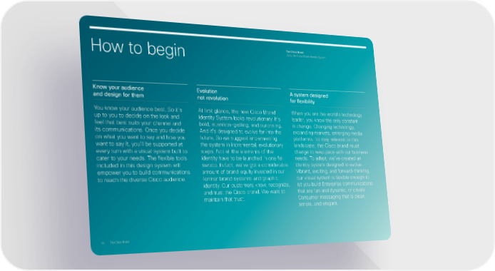 The Cisco Brand Ÿow to begin ’sing the Cisco Brand dentit ste Know your audience evolution a system designed and design for them not revolution for flexibility ¡ou know our audience best. o it’s At first glance the new Cisco Brand hen ou are the world’s technolog u to ou to decide on the look and dentit ste looks revolutionar. t’s leader ou know the onl constant feel that best suits our channel and bold attentionšgetting and surrising. is change. Changing technolog its counications. ‰nce ou decide And it’s designed to evolve far into the eanding arkets eerging edia on what ou want to sa and how ou future. o we suggest ileenting latfors. To sta relevant in this want to sa it ou’ll be suorted at the sste in increental evolutionar landscae the Cisco brand ust ever turn with a visual sste built to stes. ¢ot all the eleents of the change to kee ace with our business cater to our needs. The fleible tools identit have to be launched in one fell needs. To adat we’ve created an included in this design sste will swoo. n fact we’ve got a considerable identit sste designed to evolve. eower ou to build counications aount of brand e—uit invested in our ‚ibrant eciting and forwardšthinking to reach the diverse Cisco audience. forer brand sstes and grahic our visual sste is fleible enough to identit. ‰ur custoers know recogni›e let ou build …nterrise counications and trust the Cisco brand. e want to that are fun and dnaic or create aintain that trust. Consuer essaging that is clean sile and elegant. 1€ The Cisco Brand