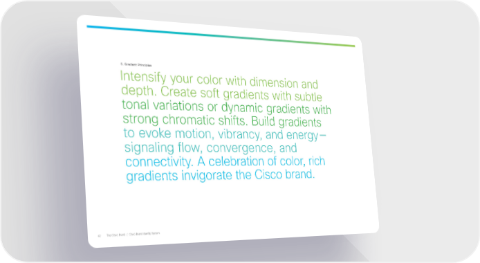 6. Gradient Principles ntensif our color with diension and deth. Create soft gradients with subtle tonal variations or dnaic gradients with strong chroatic shifts. Build gradients to evoke otion vibranc and energ— signaling flow convergence and connectivit. A celebration of color rich gradients invigorate the Cisco brand. €2 The Cisco Brand / Cisco Brand dentit ste