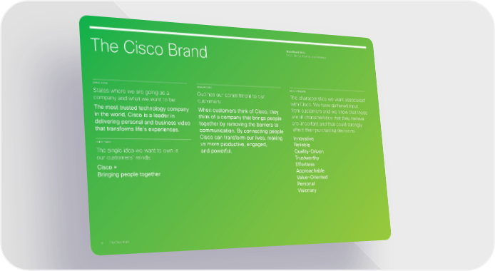 Cisco Brand Story The Cisco Brand ‚ision tance ƒroise and Attributes Brand VISIon Brand PromISe Brand aTTrIBuTeS tates where we are going as a ‰utlines our coitent to our The characteristics we want associated coan and what we want to be“ custoers“ with Cisco. e have gathered inut The most trusted technology company When customers think of Cisco, they fro custoers and we know that these in the world, Cisco is a leader in think of a company that brings people are all characteristics that the believe delivering personal and business video together by removing the barriers to are iortant and that could strongl that transforms life’s experiences. communication. By connecting people affect their urchasing decisions. Cisco can transform our lives, making Innovative Brand STanCe us more productive, engaged, reliable The single idea we want to own in and powerful. Quality-driven our custoers’ inds“ Trustworthy Cisco = effortless Bringing people together approachable Value-oriented Personal Visionary „ The Cisco Brand