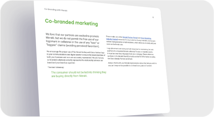 Co-branding with Meraki 12 Co-branded marketing Please make use of the Meraki Partner Portal and Cisco Marketing We love that our partners are excited to promote Meraki, but we do not permit the free use of our Velocity Central resources for any customer-facing materials, such as pre- logomark in collateral or the use of any “best” or written lead generation email templates, which allow you to easily add your name and referral code. “biggest” claims (avoiding perceived favoritism). Logo placement and sizing are both important in maintaining the look and feel of co-branded Meraki collateral. For any co-branded assets, We encourage the proper use of the Meraki lockup and Cisco Partner logo it must be clear they originated from your company. Please reference in your communications and digital assets to ensure the brand identities of sections in the Meraki Brand Elements section for information on using both your business and ours are accurately represented. We ask that any the Cisco Meraki Partner wordmark. co-branded collateral correctly represents the relationship between our brand and your brand as a partner. Always check with your Meraki representative about the item you wish to use, as it may not be possible to co-brand every piece of content. The main takeaway: The consumer should not be led into thinking they are buying directly from Meraki.