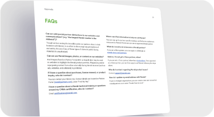 Appendix 21 FAQs Can we add special partner distinctions to our websites and Where can I 昀椀nd information to help me sell Meraki? communications? (e.g. “the largest Meraki reseller in the midwest”)? You can sign up for partner-speci昀椀c trainings and 昀椀nd sales enablement resources on Partner Portal once you are an approved Meraki partner. Though we love seeing the incredible pride our partners share in their What do I need to do to become a Meraki partner? business with Meraki, in an effort to discourage any perceptions of If you are a Cisco partner, you can apply to sell Meraki at exclusivity, the use of any of these types of claims in public-facing materials is unauthorized. meraki.cisco.com/partners. Can we use Meraki images, photos, or content on our websites? Hold on, I’m not yet a Cisco partner, either! Any imagery found on Partner Portal, MVC or BrandFolder may be used If you are not a Cisco partner, follow these instructions. Once approved on websites to highlight the Meraki product portfolio. Plagiarizing and/or as a Cisco partner, you can then apply to sell Meraki following the steps above. repurposing content from other externally-facing Meraki sources (such as ads, websites, and collateral) is prohibited. Who do I contact regarding Meraki product issues? If I have a question about purchases, license renewal, or product Contact support@meraki.com. inquiry, who do I contact? You can contact your Meraki rep. Contact details are located on Partner How do I update my email address with Meraki? Portal (merakipartners.com), under “Find My Rep.” If you’ve changed organizations, you can create a new user account at I have a question about a Meraki technical training or questions merakipartners.com under “Create New Account.” around my CMNA certi昀椀cation, who do I contact? Email certifications@meraki.com.