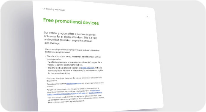 Co-branding with Meraki 17 Free promotional devices Our webinar program offers a free Meraki device or licenses for all eligible attendees. This is a tried and true lead generation engine that you can also leverage. When messaging our *free gear program to your customers, please keep the following guidelines in mind: • The offer is from Cisco Meraki. Please make it clear that the is not from your organization. • The offer is not exclusive to your customers. Please don’t suggest that a free device can only be obtained through you. • The offer is only valid through webinars on meraki.cisco.com. Webinars hosted on partner platforms or independently by partners are not eligible for free promotional devices. *Disclaimer: You should always use their unique referral code to track the leads they generate. The code can be found on merakipartners.com with detailed instructions on how to use it. *Eligible customers can receive free gear for attending some webinars, in accordance with terms and conditions which can be found at meraki.com/ freeap, meraki.com/freeswitch, meraki.com/freesm and meraki.com/freemx. *U.S. K-12 schools, public libraries, and any foreign o昀케cials as de昀椀ned under anti-corruption statutes are not eligible to receive a Promotional Device. Instead, these customers can request a product evaluation.