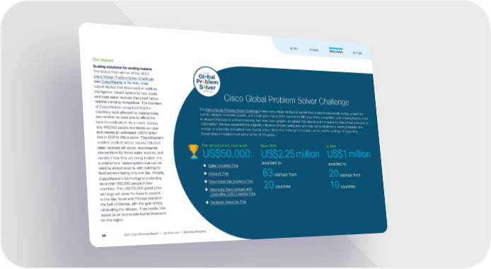 Our impact Scaling solutions for ending malaria The Grand Prize winner of the 2021 Cisco Global Problem Solver Challenge was ZzappMalaria , a Tel Aviv, Israel- based startup that developed an artificial intelligence-based system to help locate and treat water sources that could harbor malaria-carrying mosquitoes. The founders of ZzappMalaria recognized that the countries most affected by malaria today also tend to be least able to afford the tools to eradicate it. As a result, malaria kills 400,000 people worldwide per year and causes an estimated US$12 billion loss in GDP in Africa alone. ZzappMalaria’s solution predicts where malaria-infected water sources will occur, recommends interventions for those water sources, and monitors how they are being treated. It is a smartphone-based system that can be used by almost anyone—with training for field workers taking only one day. Already, ZzappMalaria’s technology is protecting more than 500,000 people in four countries. The US$250,000 grand prize winnings will allow the team to expand to the São Tomé and Príncipe islands in the Gulf of Guinea, with the goal of fully eliminating the disease. If successful, this would be an unprecedented achievement for the region. Cisco Global Problem Solver Challenge The Cisco Global Problem Solver Challenge invites early-stage startups to submit their solutions that benefit society, protect the planet, catalyze economic growth, and create jobs. Fiscal 2021 marked the fifth year of the competition, and knowing that the need to support this type of entrepreneurship has never been greater, we added new awards and increased the total annual prize pool to US$1million. We also expanded the eligibility criteria to include participants who may not be students or recent graduates of a college or university and added new special prizes. Since the challenge’s inception, we’ve had the privilege of supporting tremendous innovation from every corner of the globe. Five special prizes, each worth US$50,000: ● Digital Inclusivity Prize ● Ethical AI Prize ● Greenhouse Gas Solutions Prize ● Historically Black Colleges and Universities (HBCU) Startup Prize ● Pandemic Response Prize Since 2016: US$2.25 million awarded to 63 startups from 20 countries In 2021: US$1 million awarded to 20 startups from 10 countries FUTURE INTRO POWER INCLUSIVE 2021 Cisco Purpose Report | csr.cisco.com | ESG Reporting Hub 69