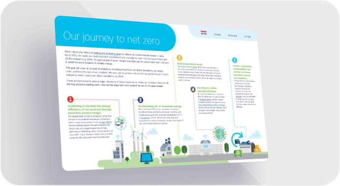 Our journey to net zero Cisco has a long history of setting and achieving goals to reduce our environmental impact. In early fiscal 2022, we made our most important commitment yet: a pledge to reach net zero greenhouse gas (GHG) emissions by 2040, 10 years ahead of when climate scientists say the planet must reach net zero to avoid the worst impacts of climate change. This goal will cover all scopes of emissions, including those from our direct operations, our supply chain, and from the use of our products. We also plan to achieve net zero for our global Scope 1 and 2 emissions, which covers our direct operations, by 2025. These announcements mark a major milestone in Cisco’s journey to Power an Inclusive Future for All. But they are just a starting point. Here are five ways we’ll work toward net zero in the years ahead: Continuing to increase the energy efficiency of our products through innovative product design. The largest share of Cisco’s emissions comes from the use of our products—and we are continuing to work to make these products more energy efficient . We are making progress through innovations like Silicon One, our programmable chip for high- performance networking, which can be found in our Cisco 8201 router. Thanks to Silicon One, the 8201 consumes 26x less power than its predecessor. Accelerati ng use of renewable energy. We’ve achieved 100 percent renewable electricity in the United States and various European countries, and in India we’ve gone from 2 percent renewables in FY15 to 66 percent in FY21. We are also exploring other investments in various renewable energy technologies in the communities where we operate. Embracing hybrid work. The future of work is hybrid . Within Cisco, we anticipate a 20 to 30 percent decline in employee commuting compared to pre-pandemic levels. Fewer trips will decrease our Scope 3 emissions from employee commuting. We will also continue to optimize our real estate portfolio, which will reduce our Scope 1 and 2 emissions. Investing in carbon removal solutions. The Cisco Foundation has committed US$100 million over 10 years to invest in climate solutions . We also invest in innovative solutions through the annual Cisco Global Problem Solver Challenge . As we build our net zero strategy, Cisco will apply this innovation lens to other promising solutions. Further embedding sustainability and circular economy principles across our business. Energy efficiency and renewable energy are not enough— we must also continue to transform the way that products are made and managed throughout their lifecycles . Cisco is committed to designing and managing its products and packaging for reuse, repair, and resource efficiency. FUTURE INTRO POWER INCLUSIVE