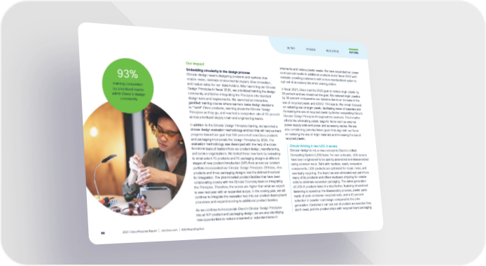 Our impact Embedding circularity in the design process Circular design means designing products and systems that enable reuse, minimize environmental impact, drive innovation, and realize value for our stakeholders. After launching our Circular Design Principles in fiscal 2020, we prioritized training the design community and further integrating the Principles into standard design tools and requirements. We launched an interactive, gamified training course where learners make design decisions to “build” Cisco products, learning about the Circular Design Principles as they go, and reached a completion rate of 93 percent across prioritized supply chain and engineering teams. In addition to the Circular Design Principles training, we launched a circular design evaluation methodology and tool that will help us track progress toward our goal that 100 percent of new Cisco products and packaging incorporate the Design Principles by 2025. The evaluation methodology was developed with the help of a cross- functional team of leaders from our product design, manufacturing, and service organizations. We tested these new tools by evaluating to what extent 15 products and 10 packaging designs at different stages of new product introduction (NPI) from across our product portfolio incorporated our Circular Design Principles. Of those, nine products and three packaging designs met the defined threshold for integration. The pilot included product families that have been collaborating closely with the Circular Economy team on integrating the Principles. Therefore, the scores are higher than what we expect to see next year with an expanded scope. In the coming year, we will continue to integrate the evaluation tool into our product development processes and expand scoring to additional product families. As we continue to incorporate Cisco’s Circular Design Principles into all NPI product and packaging design, we are also identifying new opportunities to reduce unwanted or redundant items in shipments and reduce plastic waste. We have expanded our power cord opt -out model to additional products and in fiscal 2022 we’ll evaluate providing customers with a more standardized option to opt-out of accessory kits when placing orders. In fiscal 2021, Cisco met the 2025 goal to reduce virgin plastic by 20 percent and we closed out the goal. We reduced virgin plastics by 38 percent compared to our baseline due to an increase in the use of recycled plastic and COVID-19 impacts. We remain focused on reducing use of virgin plastic, facilitating reuse of materials and increasing the use of recycled plastic by further embedding Cisco’s Circular Design Principles throughout the business. This includes efforts like eliminating plastic bags for items such as external power supply units and power and accessory cables. We are also considering potential future goals that align with our focus on reducing the use of virgin materials and increasing the use of recycled plastic. Circular thinking in new UCS-X servers Circular design is not a new concept to Cisco’s Unified Computing System (UCS) team. For over a decade, UCS servers have been engineered to be quickly assembled and disassembled using common tools. Built with modular, easily removable components, UCS products are optimized for repair, reuse, and eventually recycling. The team has also eliminated wet paint from many of its products and offers multipack shipping for smaller units to eliminate excessive packaging. The latest generation of UCS-X products takes it a step further, featuring streamlined fastening to speed up the disassembly process, plastic parts made of post-consumer recycled resin, and a 62 percent reduction in powder coat usage compared to the prior generation. Customers can opt out of product accessories they don’t need, and the product ships with recycled foam packaging. 93% training completion by prioritized teams within Cisco’s design community FUTURE INTRO POWER INCLUSIVE 2021 Cisco Purpose Report | csr.cisco.com | ESG Reporting Hub 86