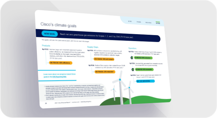 Cisco’s climate goals NEW GOAL Reach net zero greenhouse gas emissions for Scopes 1, 2, and 3 by 2040 (FY19 base year) The goals, set over the past several years, will help us reach this target: Products By FY22: Improve large rack-mounted equipment system power efficiency—as measured from the input power from the facility to the board-mounted ASICs, memory, and other chip devices—from 77% to 87% (FY16 base year). ON TRACK: 85% efficiency Supply Chain By FY25: 80% of Cisco component, manufacturing, and logistics suppliers by spend will have a public, absolute GHG emissions reduction target. ON TRACK: 38% with targets By FY30: Reduce Cisco supply chain-related Scope 3 GHG emissions by 30% absolute (FY19 base year). 1 ON TRACK: 23% reduction 2 Operations By FY22: Reduce total Cisco Scope 1 and 2 GHG emissions worldwide by 60% absolute (FY07 base year). ACHIEVED: 60% reduction By FY22: Use electricity generated from renewable sources for at least 85% of our global electricity. ACHIEVED: 85% renewable By FY25: Reach net zero greenhouse gas emissions for Scope 1 and 2 (FY19 base year). NOT YET REPORTING Learn more about our progress toward these goals in the ESG Reporting Hub . 1. Includes allocated emissions from Cisco’s Tier 1 and Tier 2 manufacturing, component, and warehouse suppliers, and calculated emissions associated with transportation emissions managed and paid for by Cisco. Emissions are allocated based on Cisco’s financial share of the supplier’s reported global Scope 1 and Scope 2 GHG emissions. Transportation emissions will be reported as Upstream Transportation and Distribution according to GHG Protocol methodology because they are paid directly by Cisco. Reporting fiscal 2020 emissions due to standard lag based on CDP supply chain data availability. 2. Due to standard reporting lag for supply chain emissions, reporting fiscal 2020 data. Significant reduction in emissions related to global supply chain disruptions; emissions expected to increase with supply chain recovery as we continue progress toward fiscal 2030 goal. FUTURE INTRO POWER INCLUSIVE 2021 Cisco Purpose Report | csr.cisco.com | ESG Reporting Hub 77