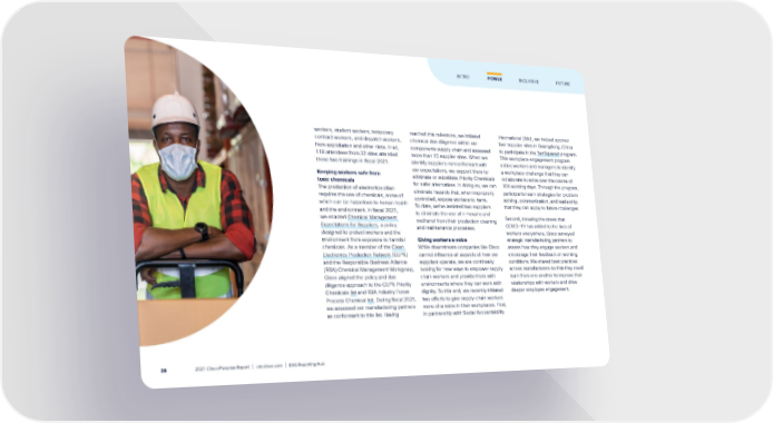 workers, student workers, temporary contract workers, and dispatch workers, from exploitation and other risks. In all, 118 attendees from 32 sites attended these two trainings in fiscal 2021. Keeping workers safe from toxic chemicals The production of electronics often requires the use of chemicals, some of which can be hazardous to human health and the environment. In fiscal 2021, we enacted Chemical Management Expectations for Suppliers , a policy designed to protect workers and the environment from exposure to harmful chemicals. As a member of the Clean Electronics Production Network (CEPN) and the Responsible Business Alliance (RBA) Chemical Management Workgroup, Cisco aligned the policy and due diligence approach to the CEPN Priority Chemicals list and RBA Industry Focus Process Chemical l ist . During fiscal 2021, we assessed our manufacturing partners as conformant to this list. Having reached this milestone, we initiated chemical due diligence within our components supply chain and assessed more than 15 supplier sites. When we identify suppliers nonconformant with our expectations, we support them to eliminate or substitute Priority Chemicals for safer alternatives. In doing so, we can eliminate hazards that, when improperly controlled, expose workers to harm. To date, we’ve assisted two suppliers to eliminate the use of n-hexane and methanol from their production cleaning and maintenance processes. Giving workers a voice While downstream companies like Cisco cannot influence all aspects of how our suppliers operate, we are continually looking for new ways to empower supply chain workers and provide them with environments where they can work with dignity. To this end, we recently initiated two efforts to give supply chain workers more of a voice in their workplaces. First, in partnership with Social Accountability International (SAI), we helped sponsor four supplier sites in Guangdong, China to participate in the TenSquared program. This workplace engagement program unites workers and managers to identify a workplace challenge that they can collaborate to solve over the course of 100 working days. Through the program, participants learn strategies for problem- solving, communication, and leadership that they can apply to future challenges. Second, knowing the stress that COVID-19 has added to the lives of workers everywhere, Cisco surveyed strategic manufacturing partners to assess how they engage workers and encourage their feedback on working conditions. We shared best practices across manufacturers so that they could learn from one another to improve their relationships with workers and drive deeper employee engagement. FUTURE INTRO POWER INCLUSIVE 2021 Cisco Purpose Report | csr.cisco.com | ESG Reporting Hub 28