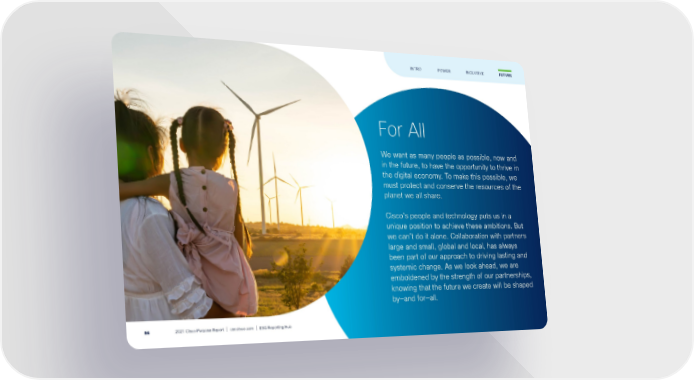 For All We want as many people as possible, now and in the future, to have the opportunity to thrive in the digital economy. To make this possible, we must protect and conserve the resources of the planet we all share. Cisco’s people and technology puts us in a unique position to achieve these ambitions. But we can’t do it alone. Collaboration with partners large and small, global and local, has always been part of our approach to driving lasting and systemic change. As we look ahead, we are emboldened by the strength of our partnerships, knowing that the future we create will be shaped by—and for—all. FUTURE INTRO POWER INCLUSIVE 2021 Cisco Purpose Report | csr.cisco.com | ESG Reporting Hub 94