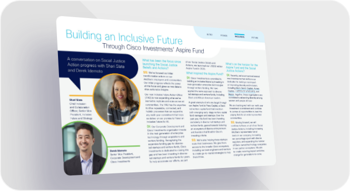 Building an Inclusive Future Through Cisco Investments' Aspire Fund A conversation on Social Justice Action progress with Shari Slate and Derek Idemoto What has been the focus since launching the Social Justice Beliefs and Actions? SS: We’ve focused our initial transformative actions on our AA/Black employees and communities. Our initial progress reflects the power of this focus and gives us new data to drive actionable insights. Our new Inclusive Future Action Office (IFAO) is now expanding what we’ve learned to replicate and scale across all communities. The IFAO has the expertise to drive repeatable, connected, and holistic processes that can expand to any multi-year commitment that helps us deliver on our promise to Power an Inclusive Future for All. DI: Our Corporate Development and Cisco Investments organization invests in the next generation of enterprise technology through acquisitions and venture funding. Recognizing the expansive funding gap for diverse- led startups and venture funds, Cisco Investments is dedicated to closing this gap and has been investing in diverse- led startups and venture funds for years. To help accelerate our efforts, as part of our Social Justice Beliefs and Actions, we launched our US$50 million Aspire Fund in 2020. What inspired the Aspire Fund? DI: Cisco Investments is committed to building an inclusive future by investing in next-generation enterprise technologies through venture funding. We have applied the same approach to diverse- led startups and venture funds, including Black and African American leaders. A great example of who we target through our Aspire Fund is Plexo Capital, a Black- led venture capital fund that invests in both emerging early-stage venture capital fund managers and startups. Over the past year, this fund has been investing exclusively in diverse-led startups and venture funds, geared towards fostering an ecosystem of diverse entrepreneurs and founders that fit within Cisco’s investing criteria. SS: We’re also helping these startups scale their businesses. We give them access to the broader Cisco ecosystem, including our best engineers and mentors to create go-to-market strategies to help them thrive. What’s on the horizon for the Aspire Fund and the Social Justice Actions? DI: Recently, we’ve announced several new investments that reinforce our dedication to making a real impact on improving diversity and inclusion, including Work-Bench Capital , Acrew Capital , L’ATTITUDE VENTURES , and Wabbi . Together, these organizations are committed to advancing diversity among women and people of color. We are tracking well with our multi-year investment commitment and continue to pursue all opportunities to level the playing field for all underrepresented communities. SS: Moving forward, we will continue to focus on all of our Social Justice Actions, including increasing AA/Black representation at all levels in our company, increasing our percentage spent with diverse suppliers, and expanding the number of Black-owned technology companies in our partner ecosystem. We aim to create recurring impact and drive change for generations to come. Shari Slate Chief Inclusion and Collaboration Officer, Senior Vice President, Inclusive Future and Strategy Derek Idemoto Senior Vice President, Corporate Development and Cisco Investments FUTURE INTRO POWER INCLUSIVE