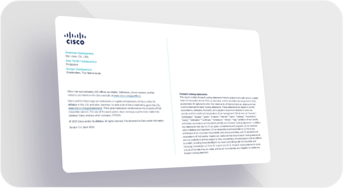 Americas Headquarters San Jose, CA, USA Asia Pacific Headquarters Singapore Europe Headquarters Amsterdam, The Netherlands Cisco has approximately 400 offices worldwide. Addresses, phone numbers, and fax numbers are listed on the Cisco website at www.cisco.com/go/offices . Cisco and the Cisco logo are trademarks or registered trademarks of Cisco and/or its affiliates in the U.S. and other countries. To view a list of Cisco trademarks, go to this URL: www.cisco.com/go/trademarks . Third party trademarks mentioned are the property of their respective owners. The use of the word partner does not imply a partnership relationship between Cisco and any other company. (111OR) © 2021 Cisco and/or its affiliates. All rights reserved. This document is Cisco public information. Version 1.4, April 2022 Forward-looking statements This report contains forward-looking statements that are subject to the safe harbors created under the Securities Act of 1933, as amended, and the Securities Ex change Act of 1934, as amended. All statements other than statements of historical facts are statements that could be deemed forward-looking statements. These statements are based on current expectations, estimates, forecasts, and projections about the industries in which we operate and the beliefs and assumptions of our management. Words such as “expects,” “anticipates,” “targets,” “goals,” “projects,” “intends,” “plans,” “believes,” “momentum,” “seeks,” “estimates,” “continues,” “endeavors,” “strives,” “may,” variations of such words, and similar expressions are intended to identify such forward-looking statements. In addition, any statements that refer to (1) our goals, commitments and programs; (2) our business plans, initiatives and objectives; (3) our assumptions and expectations; (4) the scope and impact of our corporate responsibility risks and opportunities; and (5) standards and expectations of third parties. Readers are cautioned that these forward-looking statements are only predictions and are subject to risks, uncertainties, and assumptions that are difficult to predict, including those identified in our most recent filings with the Securities and Exchange Commission on Form 10-K and Form 10-Q. Forward-looking statements speak only as of the date they are made, and we do not undertake any obligation to update any forward-looking statement.