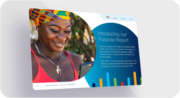 Introducing our Purpose Report Cisco’s purpose is to Power an Inclusive Future for All. To achieve our purpose, we leverage our technology and inspire our people to make a positive impact in communities worldwide and on the planet. Each word in our purpose has a meaning. In this report, you will read about the many actions we are taking to help bring our purpose to life. FUTURE INTRO POWER INCLUSIVE 6 2021 Cisco Purpose Report | csr.cisco.com | ESG Reporting Hub