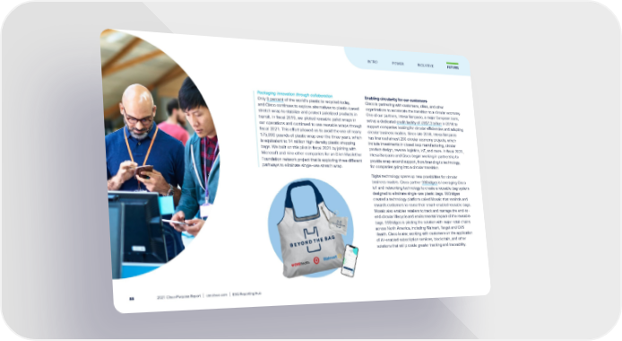 Packaging innovation through collaboration Only 9 percent of the world’s plastic is recycled today, and Cisco continues to explore alternatives to plastic-based stretch wrap to stabilize and protect palletized products in transit. In fiscal 2019, we piloted reusable pallet wraps in our operations and continued to use reusable wraps through fiscal 2021. This effort allowed us to avoid the use of nearly 175,000 pounds of plastic wrap over the three years, which is equivalent to 14 million high-density plastic shopping bags. We built on this pilot in fiscal 2021 by joining with Microsoft and nine other companies for an Ellen MacArthur Foundation network project that is exploring three different pathways to eliminate single-use stretch wrap. Enabling circularity for our customers Cisco is partnering with customers, cities, and other organizations to accelerate the transition to a circular economy. One of our partners, Intesa Sanpaolo, a major European bank, set up a dedicated credit facility of US$7.3 billion in 2018 to support companies looking for circular efficiencies and adopting circular business models. Since late 2018, Intesa Sanpaolo has financed almost 200 circular economy projects, which include investments in closed loop manufacturing, circular product design, reverse logistics, IoT, and more. In fiscal 2021, Intesa Sanpaolo and Cisco began working in partnership to provide wrap-around support, from financing to technology, for companies going into a circular transition. Digital technology opens up new possibilities for circular business models. Cisco partner 99Bridges is leveraging Cisco IoT and networking technology to create a reusable bag system designed to eliminate single-use plastic bags. 99Bridges created a technology platform called Mosaic that reminds and rewards customers to reuse their smart-enabled reusable bags. Mosaic also enables retailers to track and manage the end-to- end circular lifecycle and environmental impact of the reusable bags. 99Bridges is piloting the solution with major retail chains across North America, including Walmart, Target and CVS Health. Cisco is also working with customers on the application of AI-enabled subscription services, blockchain, and other solutions that will provide greater tracking and traceability. FUTURE INTRO POWER INCLUSIVE 2021 Cisco Purpose Report | csr.cisco.com | ESG Reporting Hub 88
