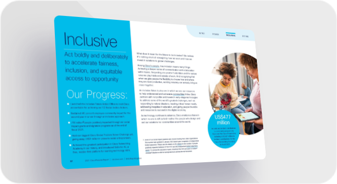 Inclusive Act boldly and deliberately to accelerate fairness, inclusion, and equitable access to opportunity Our Progress: ● Launched the Inclusive Future Action Office to hold Cisco accountable for achieving our 12 Social Justice Actions. ● Sustained 80 percent employee community impact for the second year in a row through an inclusive approach. ● 716 million A people positively impacted through our social impact grants and signature programs as of the end of fiscal 2021. ● Held our biggest Cisco Global Problem Solver Challenge yet, giving away US$1 million in prizes to social entrepreneurs. ● Achieved the greatest participation in Cisco Networking Academy in our history, and introduced Skills for All, a free, mobile-first platform for learning technology skills. What does it mean for the future to be inclusive? We believe it’s nothing short of reimagining how we work and how we invest in solutions to global challenges. Among Cisco's people , true inclusion means many things: Achieving a deeper sense of communication and collaboration within teams. Respecting one another’s identities and the various roles we play inside and outside of work. And recognizing that when we give people the flexibility to choose how and where they are most productive, working remotely can actually bring us closer together. An inclusive future is also one in which we use our resources to help underserved and vulnerable communities thrive. Cisco partners with nonprofits and invests in early-stage technologies to address some of the world’s greatest challenges, such as responding to natural disasters, meeting critical human needs, addressing inequities in education, and giving people the skills and resources to succeed in the digital economy. As technology continues to advance, Cisco envisions a future in which no one is left behind—neither the people who design and sell our solutions nor communities around the world. US$477 million in cash and in-kind contributions to community programs by Cisco and the Cisco Foundation, including US$367 million in in-kind contributions for the Cisco Networking Academy in fiscal 2021. 1. Some of our social impact grantees also receive funding from other organizations. This number was updated in January 2022 based upon completion of independent limited assurance. Please see the details on the criteria for the number of people positively impacted between FY16-FY21 and the independent limited assurance report . To access the assurance report, download the PDF and open in Adobe® Acrobat® Reader to click-to-accept terms to access the full document. FUTURE INTRO POWER INCLUSIVE 2021 Cisco Purpose Report | csr.cisco.com | ESG Reporting Hub 37
