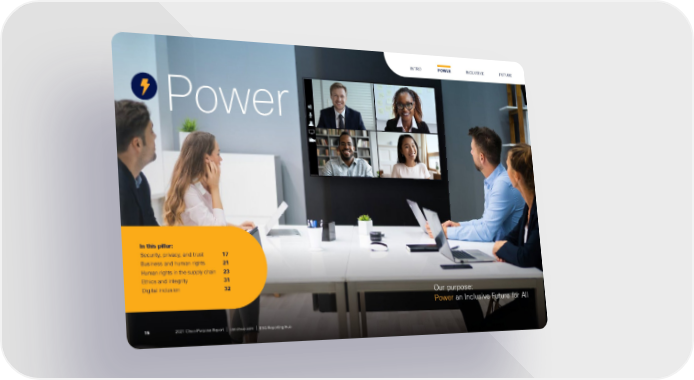 Power In this pillar: Security, privacy, and trust 17 Business and human rights 21 Human rights in the supply chain 23 Ethics and integrity 31 Digital inclusion 32 Our purpose: Power an Inclusive Future for All FUTURE INTRO POWER INCLUSIVE 2021 Cisco Purpose Report | csr.cisco.com | ESG Reporting Hub 15