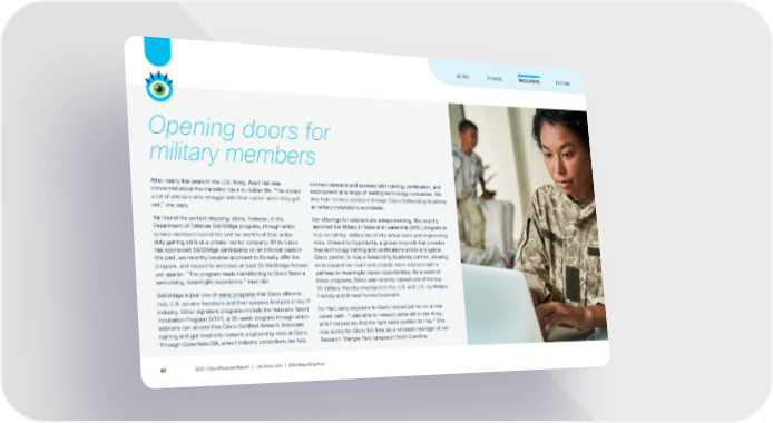 Opening doors for military members After nearly five years in the U.S. Army, Averi Hall was concerned about the transition back to civilian life. “I’ve known a lot of veterans who struggle with their career when they get out,” she says. Hall found the perfect stepping-stone, however, in the Department of Defense SkillBridge program, through which service members spend the last six months of their active duty gaining skills at a private-sector company. While Cisco has sponsored SkillBridge participants on an informal basis in the past, we recently became approved to formally offer the program, and expect to welcome at least 20 SkillBridge fellows per quarter. “The program made transitioning to Cisco Sales a welcoming, meaningful experience,” says Hall. SkillBridge is just one of many programs that Cisco offers to help U.S. service members and their spouses find jobs in the IT industry. Other signature programs include the Veterans Talent Incubation Program (VTIP), a 20-week program through which veterans can access free Cisco Certified Network Associate training and get hired into network engineering roles at Cisco. Through CyberVetsUSA, a tech industry consortium, we help connect veterans and spouses with training, certification, and employment at a range of leading technology companies. We also train service members through Cisco Networking Academy at military installations worldwide. Our offerings for veterans are always evolving. We recently launched the Military in Sales and Leadership (MISL) program to help recruit top military talent into virtual sales and engineering roles. Onward to Opportunity, a global nonprofit that provides free technology training and certifications and is a longtime Cisco partner, is now a Networking Academy partner, allowing us to expand our reach and provide more veterans with a pathway to meaningful career opportunities. As a result of these programs, Cisco was recently named one of the top 10 military-friendly employers in the U.S. and U.K. by Military Friendly and Armed Forces Covenant. For Hall, early exposure to Cisco helped put her on a new career path. “I was able to network while still in the Army, which helped me find the right sales position for me.” She now works for Cisco full-time as a renewals manager at our Research Triangle Park campus in North Carolina. FUTURE INTRO POWER INCLUSIVE 2021 Cisco Purpose Report | csr.cisco.com | ESG Reporting Hub 67