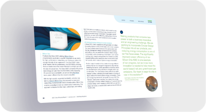 Silicon One Products like Cisco 8201 utilizing Silicon One , a programmable application-specific integrated circuit (ASIC) for high-performance networking, are helping us reduce the energy intensity of our equipment. The Cisco 8201 router is far smaller than its predecessor, the NCS 6008, shrinking from a chassis more than seven feet tall to a single rack unit the size of a pizza box. The Cisco 8201 consumes 96 percent less energy per year than the NCS 6008, while supplying 35 percent more bandwidth, as well as being five times more power-efficient than its closest competitor. With its high speeds, expanded bandwidth, and ultra-low latency, Cisco’s Silicon One chip ushered in a new era in networking. Combined with Cisco’s Acacia optics, Silicon One enables a paradigm known as routed optical networking. This approach collapses the fiber layer, optical layer, and routing layer that make up a traditional network, which would consist of two or three boxes consuming energy, into just one box, reducing the total energy consumption. Automation allows systems to run even more efficiently, putting Silicon One at the heart of some of the most sustainable and innovative networking solutions. An improved energy strategy for server products In fiscal 2021, Cisco released the M6 generation of Unified Computing System (UCS) and HX data center server products. The new products extend several of the same power and thermal management design principles found in previous generations, such as variable fan speed to reduce energy consumption, while introducing a new feature: zone-based cooling. Zone-based cooling allows the chassis to provide targeted airflow while leaving the other zones at the lower fan speeds, which reduces system energy consumption. Another major innovation is the creation of energy-efficient policies that can be changed throughout the day without restarting the server. Earlier generations of servers had to be rebooted when policy selections changed, which can be disruptive. The new design allows platforms to switch between profiles, optimizing workloads based on the time of day to reduce the overall system energy consumption. These technology improvements, along with the use of 80 Plus Titanium-rated power supplies, can reduce the energy consumption of a fully loaded chassis by 11 percent over the previous design, which equates to 689.8 kWh per year for a single rack server, or around 3000 metric tonnes of CO2e per 10,000 units. Making products that consume less power is both a business imperative and an engineering challenge. We are working to incorporate Circular Design Principles into all our products, and reducing energy consumption is one of our five focus areas. The significantly improved power efficiency of our Silicon One ASIC is one example of our progress, but we know more innovation is needed to help move the world toward net zero greenhouse gas emissions. Our team is eager to play a role in this evolution. ” — Eyal Dagan, Executive Vice President, Common Hardware Group FUTURE INTRO POWER INCLUSIVE 2021 Cisco Purpose Report | csr.cisco.com | ESG Reporting Hub 80