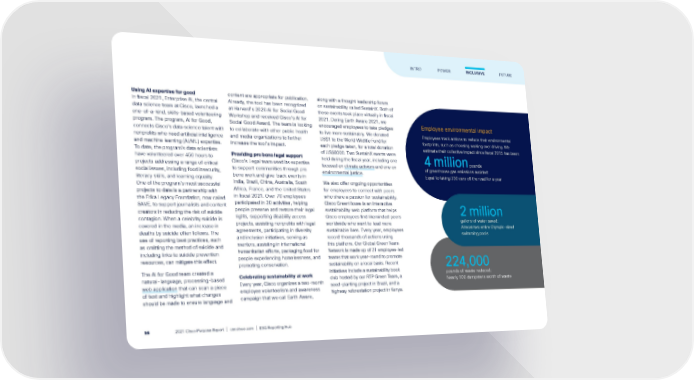 Using AI expertise for good In fiscal 2021, Enterprise AI, the central data science team at Cisco, launched a one-of-a-kind, skills-based volunteering program. The program, AI for Good, connects Cisco’s data science talent with nonprofits who need artificial intelligence and machine learning (AI/ML) expertise. To date, the program's data scientists have volunteered over 450 hours to projects addressing a range of critical social issues, including food insecurity, literacy skills, and learning equality. One of the program’s most successful projects to date is a partnership with the Erika Legacy Foundation, now called SAVE, to support journalists and content creators in reducing the risk of suicide contagion. When a celebrity suicide is covered in the media, an increase in deaths by suicide often follows. The use of reporting best practices, such as omitting the method of suicide and including links to suicide prevention resources, can mitigate this effect. The AI for Good team created a natural-language, processing-based web application that can scan a piece of text and highlight what changes should be made to ensure language and content are appropriate for publication. Already, the tool has been recognized at Harvard’s 2020 AI for Social Good Workshop and received Cisco’s AI for Social Good Award. The team is looking to collaborate with other public health and media organizations to further increase the tool’s impact. Providing pro bono legal support Cisco’s Legal team used its expertise to support communities through pro bono work and give-back events in India, Brazil, China, Australia, South Africa, France, and the United States in fiscal 2021. Over 70 employees participated in 20 activities, helping people preserve and restore their legal rights, supporting disability access projects, assisting nonprofits with legal agreements, participating in diversity and inclusion initiatives, serving as mentors, assisting in international humanitarian efforts, packaging food for people experiencing homelessness, and promoting conservation. Celebrating sustainability at work Every year, Cisco organizes a two-month employee volunteerism and awareness campaign that we call Earth Aware, along with a thought leadership forum on sustainability called SustainX. Both of these events took place virtually in fiscal 2021. During Earth Aware 2021, we encouraged employees to take pledges to live more sustainably. We donated US$1 to the World Wildlife Fund for each pledge taken, for a total donation of US$6000. Two SustainX events were held during the fiscal year, including one focused on climate activism and one on environmental justice . We also offer ongoing opportunities for employees to connect with peers who share a passion for sustainability. Cisco GreenHouse is an interactive sustainability web platform that helps Cisco employees find likeminded peers worldwide who want to lead more sustainable lives. Every year, employees record thousands of actions using this platform. Our Global Green Team Network is made up of 21 employee-led teams that work year-round to promote sustainability on a local basis. Recent initiatives include a sustainability book club hosted by our RTP Green Team, a seed-planting project in Brazil, and a highway reforestation project in Kenya. Employee environmental impact Employees track actions to reduce their environmental footprints, such as choosing walking over driving. We estimate their collective impact since fiscal 2015 has been: 4 million pounds of greenhouse gas emissions avoided: Equal to taking 330 cars off the road for a year 2 million gallons of water saved: Almost two entire Olympic-sized swimming pools 224,000 pounds of waste reduced: Nearly 100 dumpsters worth of waste FUTURE INTRO POWER INCLUSIVE 2021 Cisco Purpose Report | csr.cisco.com | ESG Reporting Hub 56