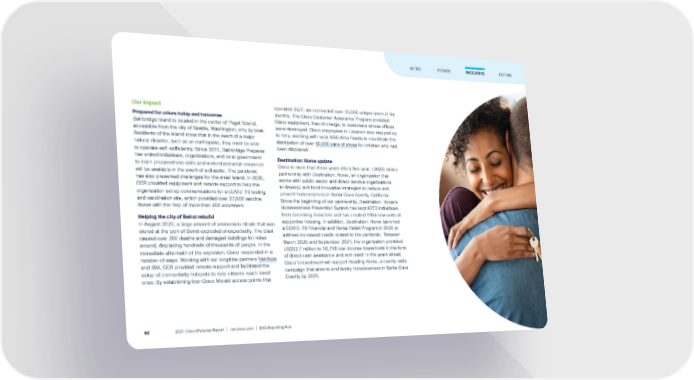 Our impact Prepared for crises today and tomorrow Bainbridge Island is located in the center of Puget Sound, accessible from the city of Seattle, Washington, only by boat. Residents of the island know that in the event of a major natural disaster, such as an earthquake, they must be able to operate self-sufficiently. Since 2011, Bainbridge Prepares has united individuals, organizations, and local government to learn preparedness skills and understand what resources will be available in the event of a disaster. The pandemic has also presented challenges for the small island. In 2020, CCR provided equipment and remote support to help the organization set up communications for a COVID-19 testing and vaccination site, which provided over 27,000 vaccine doses with the help of more than 400 volunteers. Helping the city of Beirut rebuild In August 2020, a large amount of ammonium nitrate that was stored at the port of Beirut exploded unexpectedly. The blast caused over 200 deaths and damaged buildings for miles around, displacing hundreds of thousands of people. In the immediate aftermath of the explosion, Cisco responded in a number of ways. Working with our longtime partners NetHope and IBM, CCR provided remote support and facilitated the setup of connectivity hotspots to help citizens reach loved ones. By establishing four Cisco Meraki access points that operated 24/7, we connected over 35,000 unique users in six months. The Cisco Customer Assurance Program provided Cisco equipment, free of charge, to customers whose offices were destroyed. Cisco employees in Lebanon also stepped up to help, working with local NGO Ahla Fawda to coordinate the distribution of over 50,000 pairs of shoes for children who had been displaced. Destination: Home update Cisco is more than three years into a five-year, US$50 million partnership with Destination: Home, an organization that works with public sector and direct-service organizations to develop and fund innovative strategies to reduce and prevent homelessness in Santa Clara County, California. Since the beginning of our partnership, Destination: Home's Homelessness Prevention System has kept 8273 individuals from becoming homeless and has created 1964 new units of supportive housing. In addition, Destination: Home launched a COVID-19 Financial and Rental Relief Program in 2020 to address increased needs related to the pandemic. Between March 2020 and September 2021, the organization provided US$52.7 million to 16,756 low-income households in the form of direct cash assistance and rent relief. In the years ahead, Cisco's investment will support Heading Home, a county-wide campaign that aims to end family homelessness in Santa Clara County by 2025. FUTURE INTRO POWER INCLUSIVE 2021 Cisco Purpose Report | csr.cisco.com | ESG Reporting Hub 62