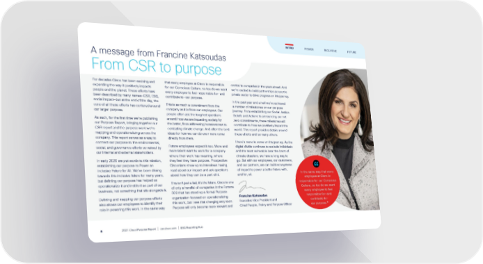 A message from Francine Katsoudas From CSR to purpose For decades Cisco has been evolving and expanding the way it positively impacts people and the planet. These efforts have been described by many names—CSR, ESG, social impact—but at the end of the day, the core of all these efforts has centered around our larger purpose. As such, for the first time we’re publishing our Purpose Report, bringing together our CSR report and the purpose work we’re mapping and operationalizing across the company. This report serves as a way to connect our purpose to the environmental, social, and governance efforts so valued by our internal and external stakeholders. In early 2020 we put words to this mission, establishing our purpose to Power an Inclusive Future for All. We’ve been driving towards this inclusive future for many years, but defining our purpose has helped us operationalize it and instills it as part of our business, not something that sits alongside it. Defining and mapping our purpose efforts also allows our employees to identify their role in powering this work. In the same way that every employee at Cisco is responsible for our Conscious Culture, so too do we want every employee to feel responsible for—and contribute to—our purpose. This is as much a commitment from the company as it is from our employees. Our people often ask the toughest questions around how we are impacting society for the better, from addressing homelessness to combating climate change. And often the best ideas for how we can do even more come directly from them. Future employees expect it too. More and more talent want to work for a company where their work has meaning, where they feel they have purpose. Prospective Cisconians show up to interviews having read about our impact and ask questions about how they can be a part of it. This isn’t just a fad; it’s the future. Cisco is one of only a handful of companies in the Fortune 500 that has stood up a formal Purpose organization focused on operationalizing this work, but I see that changing very soon. Purpose will only become more relevant and central to companies in the years ahead. And we’re excited to build partnerships across the private sector to drive progress on this journey. In the past year and a half we’ve achieved a number of milestones on our purpose journey. From establishing our Social Justice Beliefs and Actions to announcing our net zero commitments, these milestones will contribute to how we positively impact the world. This report provides details around these efforts and so many others. There’s more to come on this journey. As the digital divide continues to exclude individuals and the most vulnerable bear the brunt of climate disasters, we have a long way to go. But with our employees, our customers, and our partners, we can build ecosystems of impact to power a better future with, and for, all. Francine Katsoudas Executive Vice President and Chief People, Policy and Purpose Officer In the same way that every employee at Cisco is responsible for our Conscious Culture, so too do we want every employee to feel responsible for—and contribute to— our purpose. ” FUTURE INTRO POWER INCLUSIVE 4 2021 Cisco Purpose Report | csr.cisco.com | ESG Reporting Hub