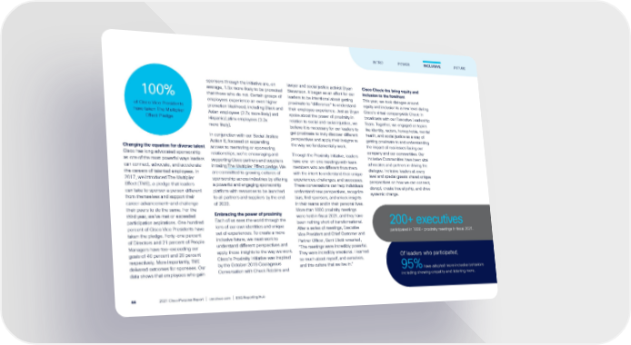 100% of Cisco Vice Presidents have taken The Multiplier Effect Pledge Changing the equation for diverse talent Cisco has long advocated sponsorship as one of the most powerful ways leaders can connect, advocate, and accelerate the careers of talented employees. In 2017, we introduced The Multiplier Effect (TME), a pledge that leaders can take to sponsor a person different from themselves and support their career advancement—and challenge their peers to do the same. For the third year, we've met or exceeded participation aspirations. One hundred percent of Cisco Vice Presidents have taken the pledge. Forty-one percent of Directors and 21 percent of People Managers have too–exceeding our goals of 40 percent and 20 percent respectively. More importantly, TME delivered outcomes for sponsees. Our data shows that employees who gain sponsors through the initiative are, on average, 1.5x more likely to be promoted that those who do not. Certain groups of employees experience an even higher promotion likelihood, including Black and Asian employees (2.7x more likely) and Hispanic/Latinx employees (3.2x more likely). In conjunction with our Social Justice Action 6, focused on expanding access to mentoring or sponsoring relationships, we’re encouraging and supporting Cisco partners and suppliers in taking The Multiplier Effect pledge . We are committed to growing cultures of sponsorship across industries by offering a powerful and engaging sponsorship platform with resources to be launched to all partners and suppliers by the end of 2022. Embracing the power of proximity Each of us sees the world through the lens of our own identities and unique set of experiences. To create a more inclusive future, we must work to understand different perspectives and apply those insights to the way we work. Cisco’s Proximity Initiative was inspired by the October 2019 Courageous Conversation with Chuck Robbins and lawyer and social justice activist Bryan Stevenson. It began as an effort for our leaders to be intentional about getting proximate to "difference" to understand their employee experience. Just as Bryan spoke about the power of proximity in relation to social and racial injustice, we believe it is necessary for our leaders to get proximate to truly discover different perspectives and apply their insights to the way we fundamentally work. Through the Proximity Initiative, leaders have one-on-one meetings with team members who are different from them with the intent to understand their unique experiences, challenges, and successes. These conversations can help individuals understand new perspectives, recognize bias, find sponsors, and unlock insights in their teams and in their personal lives. More than 1000 proximity meetings were held in fiscal 2021, and they have been nothing short of transformational. After a series of meetings, Executive Vice President and Chief Customer and Partner Officer, Gerri Elliott remarked, “The meetings were incredibly powerful. They were incredibly emotional. I learned so much about myself, and ourselves, and this culture that we live in.” Cisco Check-Ins bring equity and inclusion to the forefront This year, we took dialogue around equity and inclusion to a new level during Cisco’s virtual companywide Check-In broadcasts with our Executive Leadership Team. Together, we engaged on topics like identity, racism, homophobia, mental health, and social justice as a way of getting proximate to and understanding the impact of real issues facing our company and our communities. Our Inclusive Communities have been vital advocates and partners in driving the dialogue. Inclusive leaders at every level and special guests shared unique perspectives on how we can connect, disrupt, create true allyship, and drive systemic change. 200+ executives participated in 1000+ proximity meetings in fiscal 2021. Of leaders who participated, 95% have adopted more inclusive behaviors including showing empathy and listening more. FUTURE INTRO POWER INCLUSIVE 2021 Cisco Purpose Report | csr.cisco.com | ESG Reporting Hub 44