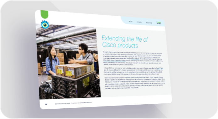 Extending the life of Cisco products Central to the concept of a circular economy is maintaining assets at their highest and best use for as long as possible. Cisco has a long-standing commitment, with programs in place for more than two decades, to facilitate product returns for reuse and recycling, to offer comprehensive service and repair, and to remanufacture used equipment for sale through Cisco Refresh . We continue to make progress toward the 2018 PACE Capital Equipment Pledge, both by simplifying the returns process for customers and partners, and by empowering our sales teams, who play an important role promoting our takeback program and Refresh products with our partners and customers. In fiscal 2021, we enhanced our tools to facilitate product return at end of use by expanding the Send IT Back app. By the end of fiscal 2021, the app was available to both Android and iOS users in the United States, the Netherlands, and Germany, and we plan to expand access across additional markets globally in fiscal 2022. From spring 2020 to spring 2021, we saw a 156 percent increase in products returned via the app. Returned products have played an important role in fulfilling demand as COVID-19 and a variety of natural disasters significantly impacted the IT supply chain with component shortages and production delays. Cisco Refresh, our program for certified remanufactured equipment, helped support customers’ business resiliency with immediate product availability. It also provides customers with equipment with a reduced environmental footprint, since remanufactured products generally have less environmental impact due to raw materials extraction and manufacturing compared to new products. FUTURE INTRO POWER INCLUSIVE 2021 Cisco Purpose Report | csr.cisco.com | ESG Reporting Hub 89