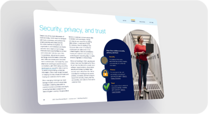 Security, privacy, and trust Data is one of the most vital assets of business today. And it must be managed with tools, processes, and policies that enable security and privacy across the entire business ecosystem. As organizations and individuals worldwide become more reliant on technology, there are more opportunities to connect and collaborate—but also more risks. In a pandemic-altered world, people exchange more information online than ever before as remote work becomes more commonplace. Consequently, cyber attacks are evolving to exploit insecure connections, with 2020 being one of the worst years on record for data breaches. To avoid compromising confidential information, Cisco must remain focused on staying one step ahead of threats and helping our customers do the same. Other emerging challenges we must manage include concerns about data localization (retaining data within a country’s borders) and data sovereignty (ensuring that data is subject to the laws of a given country). As geopolitical factors or customer concerns about data localization and sovereignty change, one way we can respond is by adding data centers. In response to Brexit, for example, Cisco is building a new European data center in Frankfurt to complement our data center in the United Kingdom. Cisco is committed to helping our customers and partners by protecting and respecting data, no matter where it originates or where it flows. Since our founding in 1984, security and privacy have been foundational for Cisco. As we have transitioned to provide more software-based solutions, dependable security and privacy by design have become more critical than ever. We’ve committed to investing across people, policies, processes, and technology to support the security, privacy, fairness, accessibility, and resilience that lead to customer trust. How Cisco defines security, privacy, and trust Security The features that enable authorized use, access, integrity, and availability of confidential information. Privacy The transparent, fair, and accountable processing of personal information. Cisco’s Privacy Principles . Trust The result of Cisco’s efforts to build and maintain credibility with customers. Cisco’s Trust Principles . FUTURE INTRO POWER INCLUSIVE 2021 Cisco Purpose Report | csr.cisco.com | ESG Reporting Hub 17