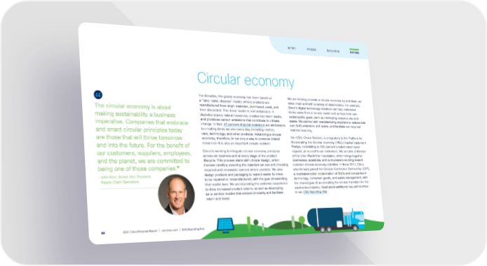 Circular economy For decades, the global economy has been based on a “take-make-dispose” model, where products are manufactured from virgin materials, purchased, used, and then discarded. This linear model is not sustainable. It depletes scarce natural resources, creates too much waste, and produces carbon emissions that contribute to climate change. In fact, 45 percent of global emissions are attributable to creating items we use every day, including clothes, cars, technology, and other products. Advancing a circular economy, therefore, is not only a way to preserve limited resources—it is also an important climate solution. Cisco is working to integrate circular economy principles across our business and at every stage of the product lifecycle. This process starts with circular design, which involves carefully selecting the materials we use and choosing recycled and renewable sources where possible. We also design products and packaging to make it easier for them to be repaired or remanufactured, with the goal of extending their useful lives. We are improving the customer experience to drive increased product returns, as well as developing as-a-service models that embed circularity and facilitate return and reuse. We are helping promote a circular economy up and down our value chain and with a variety of stakeholders. For example, Cisco’s digital technology solutions can help customers derive value from a circular model and achieve their own sustainability goals, such as minimizing resource use and waste. We partner with manufacturing suppliers to reduce their own GHG emissions and waste, and facilitate our recycled material sourcing. Our CEO, Chuck Robbins, is a signatory to the Platform for Accelerating the Circular Economy (PACE) Capital Equipment Pledge, committing to 100 percent product return upon request, at no cost to our customers. We are also a Member of the Ellen MacArthur Foundation, which brings together businesses, academia, and policymakers working toward common circular economy priorities. In fiscal 2021, Cisco also formally joined the Circular Electronics Partnership (CEP), a multistakeholder collaboration of NGOs and companies in technology, consumer goods, and waste management, with the shared goal of accelerating the circular transition for the electronics industry. Read about additional key partnerships in our ESG Reporting Hub . The circular economy is about making sustainability a business imperative. Companies that embrace and enact circular principles today are those that will thrive tomorrow and into the future. For the benefit of our customers, suppliers, employees, and the planet, we are committed to being one of those companies. ” — John Kern, Senior Vice President, Supply Chain Operations FUTURE INTRO POWER INCLUSIVE 2021 Cisco Purpose Report | csr.cisco.com | ESG Reporting Hub 84