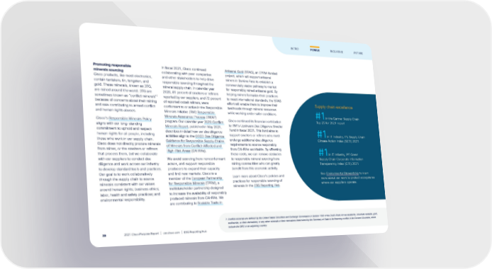Promoting responsible minerals sourcing Cisco products, like most electronics, contain tantalum, tin, tungsten, and gold. These minerals, known as 3TG, are mined around the world. 3TG are sometimes known as “conflict minerals” 1 because of concerns about their mining and sale contributing to armed conflict and human rights abuses. Cisco’s Responsible Minerals Policy aligns with our long-standing commitment to uphold and respect human rights for all people, including those who work in our supply chain. Cisco does not directly procure minerals from mines, or the smelters or refiners that process them, but we collaborate with our suppliers to conduct due diligence and work across our industry to develop standard tools and practices. Our goal is to work collaboratively through the supply chain to source minerals consistent with our values around human rights; business ethics; labor, health and safety practices; and environmental responsibility. In fiscal 2021, Cisco continued collaborating with peer companies and other stakeholders to help drive responsible sourcing throughout the mineral supply chain. In calendar year 2020, 81 percent of smelters or refiners reported by our suppliers, and 72 percent of reported cobalt refiners, were conformant to or active in the Responsible Minerals Initiative (RMI) Responsible Minerals Assurance Process (RMAP) program. Our calendar year 2020 Conflict Minerals Report , published in May 2021, describes in detail how our due diligence activities align to the OECD Due Diligence Guidance for Responsible Supply Chains of Minerals from Conflict-Affected and High-Risk Areas (CAHRAs). We avoid sourcing from nonconformant actors, and support responsible producers to expand their capacity and find new markets. Cisco is a member of the European Partnership for Responsible Minerals (EPRM), a multistakeholder partnership designed to increase the availability of responsibly produced minerals from CAHRAs. We are contributing to Scalable Trade in Artisanal Gold (STAG), an EPRM-funded project, which will support artisanal miners in Burkina Faso to establish a commercially viable pathway to market for responsibly mined artisanal gold. By helping miners formalize their practices to meet international standards, the STAG effort will enable them to improve their livelihoods through mineral resources while working under safer conditions. Cisco continued its financial contribution to RMI’s Upstream Due Diligence Smelter Fund in fiscal 2021. This fund aims to support smelters or refiners who must undergo additional due diligence requirements to source responsibly from CAHRAs worldwide. By offsetting these costs, we can remove obstacles to responsible mineral sourcing from mining communities who can greatly benefit from this economic activity. Learn more about Cisco’s policies and practices for responsible sourcing of minerals in the ESG Reporting Hub . 1. Conflict minerals are defined by the United States Securities and Exchange Commission in Section 1502 of the Dodd-Frank Act as cassiterite, columbite-tantalite, gold, wolframite, or their derivatives, or any other minerals or their derivatives determined by the Secretary of State to be financing conflict in the Covered Countries, which include the DRC or an adjoining country. Supply chain excellence #1 in the Gartner Supply Chain Top 25 for 2021 report #1 in IT Industry, IPE Supply Chain Climate Action Index (SCTI) 2021 #1 in IT Industry, IPE Green Supply Chain Corporate Information Transparency Index (CITI) 2021 See Environmental Stewardship to learn more about our work to protect ecosystems where our suppliers operate. FUTURE INTRO POWER INCLUSIVE 2021 Cisco Purpose Report | csr.cisco.com | ESG Reporting Hub 30
