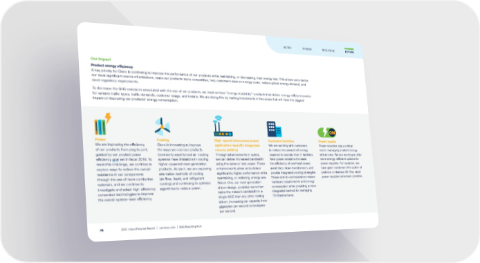 Our impact Product energy efficiency A key priority for Cisco is continuing to improve the performance of our products while maintaining, or decreasing, their energy use. This allows us to tackle our most significant source of emissions, make our products more competitive, help customers save on energy costs, reduce global energy demand, and meet regulatory requirements. To decrease the GHG emissions associated with the use of our products, we must achieve “energy scalability”—products that deliver energy-efficient service for variable traffic types, traffic demands, customer usage, and installs. We are doing this by making investments in five areas that will have the biggest impact on improving our products’ energy consumption: Power We are improving the efficiency of our products from plug to port, guided by our product power efficiency goal set in fiscal 2018. To meet this challenge, we continue to explore ways to reduce the overall resistance in our components through the use of more conductive materials, and we continue to investigate and adapt high-efficiency conversion technologies to improve the overall system-level efficiency. Cooling Cisco is innovating to improve the ways we cool our products. Commonly used forced air-cooling systems have limitations in cooling higher-powered next-generation products. As such, we are exploring alternative methods of cooling (air flow, liquid, and refrigerant cooling) and continuing to optimize algorithms to reduce power. High-speed interconnects and application-specific integrated circuits (ASICs) Through advancements in optics, we can deliver increased bandwidth using the same or less power. These enhancements allow us to deliver significantly higher performance while maintaining, or reducing, energy use. Silicon One, our next-generation silicon design, provides more than twice the network bandwidth in a single ASIC than any other routing silicon, increasing our capacity from gigabytes per second to terabytes per second. Customer facilities We are working with customers to reduce the amount of energy required to operate their IT facilities. New power solutions increase the efficiency of overhead power, avoid step-down transformers, and provide integrated cooling strategies. These end-to-end solutions reduce hardware requirements and energy consumption while providing a more integrated method for managing IT infrastructures. Power supply Power supplies play a critical role in managing product energy efficiencies. We are working to offer more energy-efficient options for power supplies. For example, we have given customers the option of platinum or titanium 80 Plus rated power supplies whenever possible. FUTURE INTRO POWER INCLUSIVE 2021 Cisco Purpose Report | csr.cisco.com | ESG Reporting Hub 79