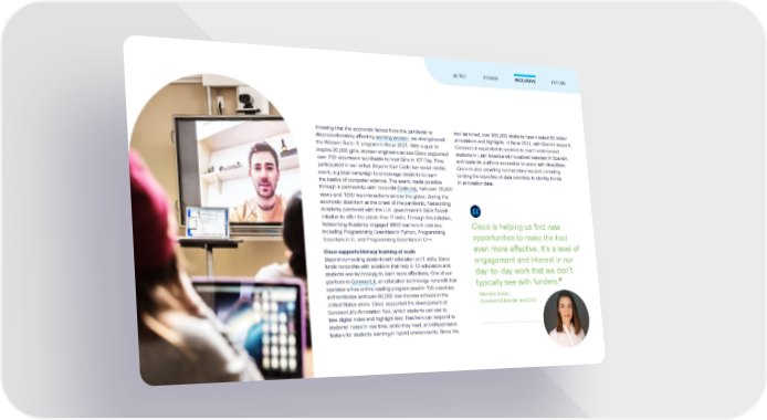 Knowing that the economic fallout from the pandemic is disproportionately affecting working women , we strengthened the Women Rock-IT program in fiscal 2021. With a goal to inspire 20,000 girls, women engineers across Cisco supported over 250 volunteers worldwide to host Girls in ICT Day. They participated in our virtual Anyone Can Code live social media event, a global campaign to encourage students to learn the basics of computer science. The event, made possible through a partnership with nonprofit Code.org , had over 16,000 views and 1000 live interactions across the globe. During the economic downturn at the onset of the pandemic, Networking Academy partnered with the U.K. government's Skills Toolkit Initiative to offer the public free IT skills. Through this initiative, Networking Academy engaged 8800 learners in courses, including Programming Essentials in Python, Programming Essentials in C, and Programming Essentials in C++. Cisco supports literacy learning at scale Beyond connecting students with education on IT skills, Cisco funds nonprofits with solutions that help K-12 educators and students use technology to learn more effectively. One of our grantees is CommonLit , an education technology nonprofit that operates a free online reading program used in 195 countries and territories and over 60,000 low-income schools in the United States alone. Cisco supported the development of CommonLit’s Annotation Tool, which students can use to take digital notes and highlight text. Teachers can respond to students’ notes in real time, while they read, an indispensable feature for students learning in hybrid environments. Since the tool launched, over 600,000 students have created 69 million annotations and highlights. In fiscal 2021, with Cisco’s support, CommonLit expanded its services to reach underserved students in Latin America with localized materials in Spanish, and made its platform accessible to users with disabilities. Cisco is also providing nonmonetary support, including lending the expertise of data scientists to identify trends in annotation data. Cisco is helping us find new opportunities to make the tool even more effective. It’s a level of engagement and interest in our day -to-day work that we don’t typically see with funders. ” — Michelle Brown, CommonLit founder and CEO FUTURE INTRO POWER INCLUSIVE