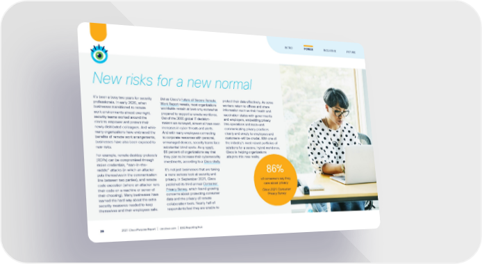 New risks for a new normal It’s been a busy two years for security professionals. In early 2020, when businesses transitioned to remote work environments almost overnight, security teams worked around the clock to empower and protect their newly distributed colleagues. And while many organizations have embraced the benefits of remote work arrangements, businesses have also been exposed to new risks. For example, remote desktop protocols (RDPs) can be compromised through stolen credentials, “man-in-the- middle” attacks (in which an attacker puts themselves in the communication line between two parties), and remote code execution (where an attacker runs their code on a machine or server of their choosing). Many businesses have learned the hard way about the extra security measures needed to keep themselves and their employees safe. But as Cisco’s Future of Secure Remote Work Report reveals, most organizations worldwide remain at best only somewhat prepared to support a remote workforce. Out of the 3000 global IT decision- makers we surveyed, almost all have seen increases in cyber threats and alerts. And with many employees connecting to corporate resources with personal, unmanaged devices, security teams face substantial blind spots. As a result, 66 percent of organizations say that they plan to increase their cybersecurity investments, according to a Cisco study . It’s not just businesses that are taking a more serious look at security and privacy. In September 2021, Cisco published its third annual Consumer Privacy Survey , which found growing concerns about protecting consumer data and the privacy of remote collaboration tools. Nearly half of respondents feel they are unable to protect their data effectively. As some workers return to offices and share information such as their health and vaccination status with governments and employers, embedding privacy into operations and tools—and communicating privacy practices clearly and simply to employees and customers—will be crucial. With one of the industry’s most robust portfolios of solutions for a secure, hybrid workforce, Cisco is helping organizations adapt to this new reality. 86% of consumers say they care about privacy Cisco 2021 Consumer Privacy Survey FUTURE INTRO POWER INCLUSIVE 2021 Cisco Purpose Report | csr.cisco.com | ESG Reporting Hub 20