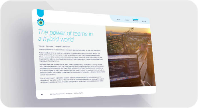 The power of teams in a hybrid world "Inspired.” “Connected.” “Energized.” “Refreshed." Those are just a few of the ways that Cisco employees described feeling after our first-ever Teams Week. As we innovate to serve our customers and partners in a future where work is connected, flexible, and hybrid, we know that we must evolve the way we work internally, too. That’s why we organized Teams Week, a series of virtual sessions delivered to teams worldwide, packed with ideas and inspiration for how to approach the future of work. Sessions covered such topics as embracing change, improving digital body language, and avoiding burnout. But Teams Week was more than just an event. It was the beginning of a conversation, a common mindset, and a practice that teams at Cisco now share moving forward. Curated content and resources from the event are available on Cisco’s intranet, and Teams Week has evolved into Teams Weekly, a weekly series during which teams engage on topics and in ways that are most relevant to them. For example, a team can vote on a session to watch, then organize a “watch party” to view it together, followed by a discussion about what the content means for them. One participant says, “I enjoyed the sessions, but what made it especially fun and valuable were the discussions it sparked in our team.” We view this as an essential investment in our people at this point in our industry’s evolution and look forward to seeing what our more closely connected teams can deliver. FUTURE INTRO POWER INCLUSIVE 2021 Cisco Purpose Report | csr.cisco.com | ESG Reporting Hub 52