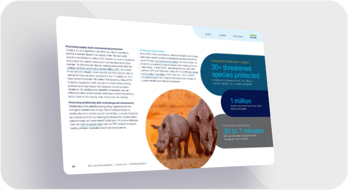 Promoting supply chain environmental protection Pollution is not a significant risk within our direct operations, but it is a relevant issue in our supply chain. We work with suppliers worldwide to reduce their impacts on local ecosystems and protect the natural resources in communities where they operate. To this end, we have an ongoing partnership with the Institute of Public and Environmental Affairs (IPE) . As a result of our work to mitigate environmental risk from supplier sites in mainland China, we were ranked #1 in the IT industry on IPE’s most recent Corporate Information Transparency Index (CITI). Ongoing engagement with suppliers includes virtual training seminars and coaching to help suppliers correct pollution violations. By building the capability of suppliers, we can influence better environmental performance and transparency further down in the supply chain and across our industry. Protecting biodiversity with technology and investments Biodiversity is the variability among living organisms and the ecological habitats they occupy. Cisco’s primary impact on biodiversity is the land we use for our facilities, a physical footprint we continue to shrink by reducing the demand for physical office space through our move toward hybrid work. On a more delicious note, we host honeybee hives near our RTP campus to support healthy pollinator populations and local food systems. Connected Conservation Since 2015, Cisco surveillance, data and analytics technology have been used to protect endangered species around the world through Connected Conservation —the first solution of its kind to proactively protect animals while leaving them to roam freely. In fiscal 2021, stemming from our work with partners NTT and Dimension Data, the nonprofit Connected Conservation Foundation (CCF) was born. CCF enables increased support for projects that deploy technology to protect wildlife and natural ecosystems. Connected Conservation’s impact 30+ threatened species protected including the endangered black rhino, African elephant, pangolin, lion, cheetah, and giraffe 1 million hectares secured across Kenya, South Africa, and Zambia R esponse times reduced from 30 to 7 minutes with real-time data bringing improved management and protection FUTURE INTRO POWER INCLUSIVE 2021 Cisco Purpose Report | csr.cisco.com | ESG Reporting Hub 93