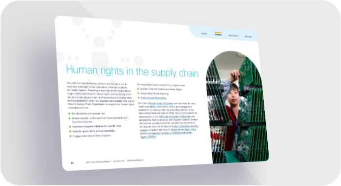 Human rights in the supply chain Our external manufacturing partners and suppliers are an important extension of our operations. How our products are made matters. Powering a more just and inclusive future begins with protecting the human rights and wellbeing of the workers in our supply chain—and respecting the communities and ecosystems in which our suppliers are located. The role of Cisco’s Supply Chain Organization to support our human rights commitments is to: ● Set standards and evaluate risk. ● Assess supplier conformance to those standards and help them improve. ● Implement targeted initiatives for specific risks. ● Establish governance and accountability. ● Engage externally to drive progress. The organization works across three program areas: ● Supplier Code of Conduct and Human Rights ● Responsible Mineral Sourcing ● Environmental Stewardship Our Cisco Supplier Code of Conduct sets standards for labor, health and safety, environment, ethics, and management systems in our supply chain. As a founding member of the Responsible Business Alliance (RBA), Cisco contributed to the development of the RBA Code of Conduct (RBA Code) and adopted the RBA Code as our own Supplier Code of Conduct . We hold our suppliers—and their suppliers—accountable to the Supplier Code of Conduct and other responsible sourcing policies consistent with Cisco’s Global Human Rights Policy and the UN Guiding Principles on Business and Human Rights (UNGPs) . FUTURE INTRO POWER INCLUSIVE 2021 Cisco Purpose Report | csr.cisco.com | ESG Reporting Hub 23