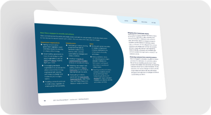 Mitigating risk of ransomware attacks Ransomware is a type of malware that allows a hacker to encrypt an organization’s data, preventing users from accessing files or databases until a ransom is paid. Ransomware attacks can target a company’s operations, service delivery to customers, supply chain, or end users. To help safeguard Cisco and our customers, we evaluate each of these risk scenarios and work closely with internal IT and engineering teams to identify, understand, and remediate gaps and vulnerabilities that might put the company or our customers at risk. Protecting customers from counterfeit products Cisco is engaged in a decades-long effort to prevent and detect the distribution of counterfeit products. We do this by embedding security tools in Cisco products that validate their authenticity and educating customers about how to protect themselves. To stop bad actors, we employ strategies to detect potential compromises and partner with law enforcement and government agencies to investigate and disrupt counterfeiting operations. How Cisco engages in security and privacy Cisco connects across the public and private sectors and with the next generation of potential industry talent to help improve the world’s overall cyber posture. Here are a few of the many ways we engage: Government organizations ● Raising concerns when government legislation could potentially impact the security or privacy of technology. ● Spearheading agreements to share threat intelligence with select organizations, such as NATO and Interpol , to jointly fight cyber crime. ● Encouraging standards organizations to accelerate the advancement of technology engineered with security and privacy by design and trustworthy technologies built in. ● Providing comments and input on draft privacy legislation to enable global interoperability. Industry peers ● Participating in industry working groups and international standards bodies to help develop better collective cyberresilience strategies and privacy practices. ● Investing in a Center of Excellence and Co-Innovation to focus on security and privacy. ● Publishing new research and leading practices in Cisco’s Trust Center to share what we have learned with the public. ● Participating in industry events such as Cybersecurity Awareness Month , Data Privacy Day, and Privacy Awareness Weeks in multiple countries. Talent ● Working with global universities on research projects and programs dedicated to the enhancement of security and privacy. ● Making multimillion-dollar, non-directed grants to higher education institutions to fund research and support internships on security and privacy topics. ● Teaching security and privacy courses to students around the world through Cisco Networking Academy and working with higher education institutions to develop security and privacy curricula. FUTURE INTRO POWER INCLUSIVE 2021 Cisco Purpose Report | csr.cisco.com | ESG Reporting Hub 19