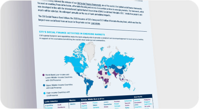 Latin America Mexico Europe, Middle East & Africa Asia Pacific Argentina Bahamas Brazil Chile Colombia Costa Rica D.R. Ecuador El Salvador Guatemala Haiti Honduras Jamaica Panama Paraguay Peru Puerto Rico Trinidad/ Tobago Uruguay Mexico Algeria Austria Bahrain Belgium Bulgaria Cameroon Congo, DR Côe d’Ivoire Czech Rep. Denmark Egypt Finland France Gabon Germany Ghana Greece Hungary Iraq Ireland Israel Italy Jersey Jordan Kazakhstan Kenya Kuwait Lebanon Luxembourg Mauritius Monaco Morocco Netherlands Nigeria Norway Pakistan Poland Portugal Qatar Romania Russia Saudi Arabia Senegal Slovakia South Africa Spain Sweden Switzerland Tanzania Tunisia Turkey UAE UK Uganda Ukraine Zambia Australia Bangladesh China Hong Kong India Indonesia Japan Macau Malaysia New Zealand Philippines Singapore South Korea Sri Lanka Taiwan Thailand Vietnam North America United States Canada Bond Offerings Advance Social Initiatives In October 2021, we issued o ur inaugural Citi Social Finance Bond, a $1 billion bond offering to support social and economic development efforts or activities that increase opportunity and access to essential basic services. Proceeds from the bond will finance a range of projects, including those that expand access to financial services, affordable housing, basic infrastructure, healthcare and education in underserved and unbanked communities in emerging markets. The bond offering followed the release of our Citi Social Finance Framework , one of the world’s first global social finance frameworks focused on enabling financial inclusion, affordable housing and access to essential services in emerging markets. The framework, which was developed in line with the International Capital Market Association (ICMA) Social Bond Principles 2021, * details how projects and assets will be selected. We will report annually on the use of funds and related impacts. The Citi Social Finance Bond follows the 2020 issuance of Citi’s inaugural $2.5 billion Affordable Housing Bond, which was then the largest-ever social bond from an issuer in the private sector. Learn more . * Sustainalytics, an independent provider of sustainability research, analysis and services to financial institutions globally, reviewed the Framework and confirmed in its assessment the alignment with the transparency and reporting requirements of the ICMA Social Bond Principles 2021. Worl d Bank Low-Income and Lower-Middle-Income Countries with Citi Presence Upper Middle-Income Countries with Citi Presence High-Income Countries with Citi Presence CITI’S SOCIAL FINANCE ACTIVITIES IN EMERGING MARKETS Citi's global footprint and capabilities make the bank uniquely able to provide a consistent and developed approach to local currency funding in support of the economies benefitting the world's most underserved communities. Contents ESGatCiti SustainableFinance SustainableProgress Equitable&ResilientCommunities Talent&DEI RiskManagement&ResponsibleBusiness Appendices CITI 2021 ESG REPORT 63