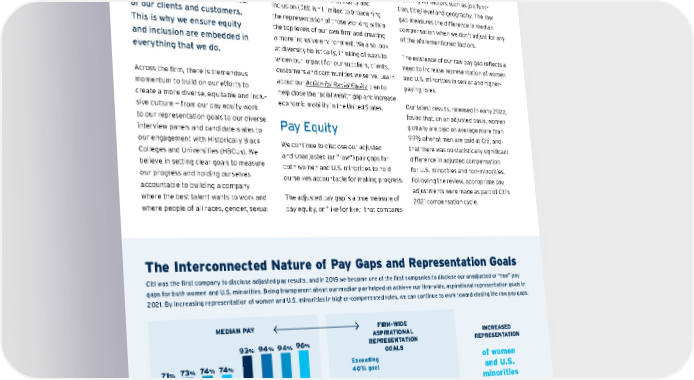Diversity, Equity & Inclusion Our workforce of more than 220,000 colleagues around the globe reflects the diverse backgrounds and perspectives of our clients and customers. This is why we ensure equity and inclusion are embedded in everything that we do. Across the firm, there is tremendous momentum to build on our efforts to create a more diverse, equitable and inclu - sive culture — from our pay equity work to our representation goals to our diverse interview panels and candidate slates to our engagement with Historically Black Colleges and Universities (HBCUs). We believe in setting clear goals to measure our progress and holding ourselves accountable to building a company where the best talent wants to work and where people of all races, gender, sexual orientation, disability status veteran status or ethnicity can reach their full potential. Our approach to diversity, equity and inclusion ( DEI) i sn’t l imited t o b roadening the representation of those working within the top levels of our own firm and creating a more inclusive environment. We also look at diversity holistically, thinking of ways to widen o ur i mpact f or o ur su ppliers, c lients, customers and communities we serve. Learn about ou r Action for Racial Equity plan to help c lose t he r acial w ealth g ap a nd i ncrease economic m obility i n t he U nited S tates. Pay Equity We continue to disclose our adjusted and u nadjusted ( or “ra w”) p ay g aps f or both women and U.S. minorities to hold ourselves accountable for making progress. The a djusted p ay g ap i s a t rue m easure o f pay equity, or “like for like,” that compares the c ompensation o f w omen t o me n a nd U.S. min orities t o n on-minorities w hen adjusting f or f actors su ch a s j ob fu nc - tion, t itle/level a nd g eography. T he ra w gap m easures t he d ifference i n m edian compensation w hen w e don ’t a djust f or a ny of t he a forementioned f actors. The e xistence o f o ur ra w p ay g ap r eflects a need t o i ncrease r epresentation o f w omen and U.S. minorities in senior and higher- paying ro les. Our l atest r esults, r eleased i n e arly 2 022, found t hat, o n a n a djusted b asis, w omen globally a re p aid o n a verage m ore t han 99% of what men are paid at Citi, and that t here w as n o s tatistically si gnificant difference i n a djusted c ompensation for U .S. min orities a nd n on-minorities. Following the review, appropriate pay adjustments were made as part of Citi’s 2021 c ompensation c ycle. The Interconnected Nature of Pay Gaps and Representation Goals Citi was the first company to disclose adj usted pay results, and in 2019 we became one of the first companies to disclose our unadjusted or “raw” pay gaps for both women and U.S. minorities. Being transparent about our median pay helped us achieve our firm-wide, aspirational representation goals in 2021. By increasing representation of women and U.S. minorities in higher-compensated roles, we can continue to work toward closing the raw pay gaps. MEDIAN PAY Women vs. Men INCREASED REPRESENTATION of women and U.S. minorities in higher- compensated roles to help close the raw pay gaps 74 % 2021 74 % 2020 73 % 2019 2018 71 % U.S. Minorities vs. U.S. Non-Minorities 93 % 2018 94 % 2019 94 % 2020 96 % 2021 FIRM-WIDE ASPIRATIONAL REPRESENTATION GOALS 37 % 40.6 % 2018 2021 8.1 % 6 % 2018 2021 Mid- and senio r- level female talent globally Exceeding 40% goal Exceeding 8% goal Mid- and senior- level Black talent (U.S. only) Contents ESGatCiti SustainableFinance SustainableProgress Equitable&ResilientCommunities Talent&DEI RiskManagement&ResponsibleBusiness Appendices CITI 2021 ESG REPORT 83