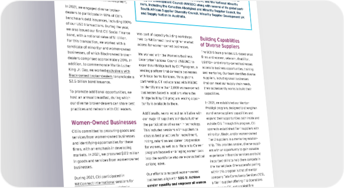 In addition to increasing our spend with diverse su ppliers, w e h ave a n Action for Racial Equity commitment to strengthen Citi’s policies and practices to become an anti-racist i nstitution. T his i ncludes e xpand - ing C iti’s c apital m arket a ctivities w ith minority-owned b roker-dealers t o a ssist with b usiness an d f ranchise d evelopment. In 2021, we engaged diverse broker- dealers to participate in 92% of Citi’s benchmark debt issuances, including 100% of our USD transactions. During the year, we also issued our first Citi Social Finance bond, with a notional value of $1 billion. For this transaction, we worked with a syndicate of minority- and women-owned businesses, of which Black-owned broker- dealers comprised approximately 20%. In addition, to commemorate Martin Luther King Jr. Day, we worked exclusively w ith Black-owned b roker-dealers to syndicate a $2.5 billion bond issuance. To promote additional opportunities, we host an annual breakfast, during which our diverse broker-dealers can share best practices and network with Citi leaders. Women-Owned Businesses Citi is committed to procuring goods and services from women-owned businesses and identifying opportunities for these firms, with an emphasis in developing markets. In 2021, we procured $172 million in goods and services from women-owned businesses. During 2021, Citi participated in WEConnect I nternational sessions for women-owned bu sinesses g lobally, that emphasized diversity and supply chain development and sustainability. We also joined WEConnect matchmaker and supplier showcase sessions in Latin America that enabled women-owned businesses to present their capabilities and make connections with Citi’s procure - ment colleagues. Similarly, Citi Indonesia was part of capacity-building workshops held by WEConnect to strengthen market access for women-owned businesses. We worked with the Women’s Business Enterprise National Council (WBENC) to expand our Bridge built by Citi SM program, a lending platform that connects businesses with local banks for loans. Through this partnership, Citi collaborated with WBENC to identify more than 2,000 women-owned businesses based in locations where the Bridge built by Citi program lending oppor - tunity is available to them. Additionally, we rolled out an initiative with our major IT suppliers in India to further the participation of women in technology. This included sessions with suppliers to discuss best practices for recruitment, hiring, retention and career progression for women, as well as a “Return to Career” program focused on bringing women back into the workforce who were on sabbatical or long leave. Our efforts to support women-owned businesses align with SDG 5: Achieve gender equality and empower all women and girls . Our work in this area helps address target 5.5 , which aims to ensure women’s full and effective participation and equal opportunities for leadership at all levels of decision-making in political, economic, and public life . SDG Goal 5: Gender Equality Building Capabilities of Diverse Suppliers The SCDIS team provides U.S.-based small firms and women-, veteran-, disability-, LGBTQ+- and minority-owned businesses access to business opportunities, training and mentoring. Our team identifies diverse suppliers, including small businesses that can meet our supply chain needs, then subsequently works to build their capabilities. In 2021, we established our Mentor- Protégé program, designed to strengthen our diverse suppliers’ capabilities and expand their opportunities both inside and outside Citi. Through this program, Citi connects established Tier 1 suppliers with minority-, Black-, and/or women-owned Tier 2 suppliers in a mentoring relation - ship. This provides smaller, diverse suppli - ers with an opportunity to gain valuable experience in financial services and build important skills to help them compete in the marketplace. One successful pairing within this program is that of mentor company Tata Consultancy Services (TCS), a Tier 1 supplier offering IT & Operations services to Citi, and protégé firm Technology Concepts Group International (TCGi), a Black-, woman-owned supplier that provides IT services to TCS for the benefit of Citi. The unique element of this pairing is that TCS has contextualized and structured the mentorship around TCGi’s current challenges and shifted gears from COLLABORATING TO BUILD SUPPLIER DIVERSITY In addition to advancing our own supplier diversity, our SCDIS team engages with others to support broader supplier diversity efforts. Our memberships with mission-centric organizations include the National LGBT Chamber of Commerce, WEConnect International, WBENC and the National Minority Supplier Development Council (NMSDC) along with several of its global part - ners, including the Canadian Aboriginal and Minority Supplier Council, the South African Supplier Diversity Council, Minority Supplier Development UK and Supply Nation in Australia. Contents ESGatCiti SustainableFinance SustainableProgress Equitable&ResilientCommunities Talent&DEI RiskManagement&ResponsibleBusiness Appendices CITI 2021 ESG REPORT 135
